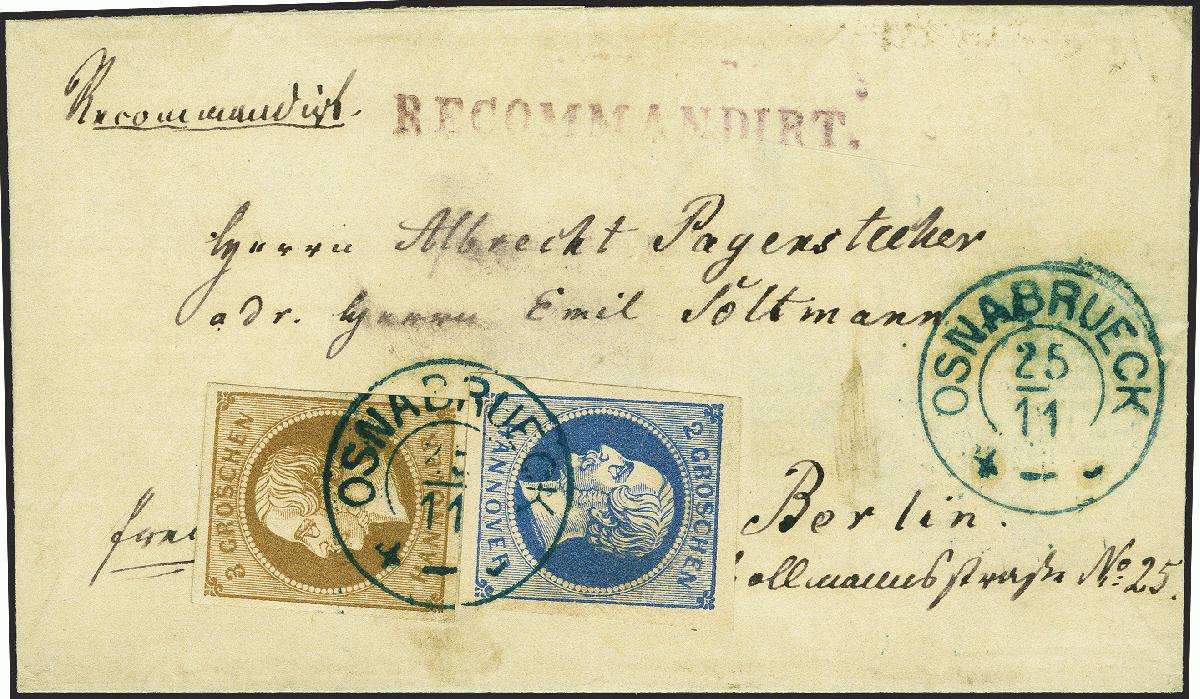 | Zusatzinformationen und Suchstichworte: | 380. Auktion Heinrich Köhler Auktionstermin 25.03.2023 Los 89 2 Groschen lebhaftultramarin in Mischfrankatur mit 1861, 3 Groschen mittelbraun, beide farbfrisch und voll- bis breitrandig, mit klar auf- und nebengesetztem Doppelkreisstempel "OSNABRUECK 25/11" auf kleiner eingeschriebener Briefhülle mit nebengesetztem violetten Langstempel "RECOMMANDIRT" nach Berlin. Fotobefund Jäschke-L. BPP (2022) Ausruf 200,00 EUR Zuschlag 850,00 EUR (aus der Sammlung Erivan Haub) |