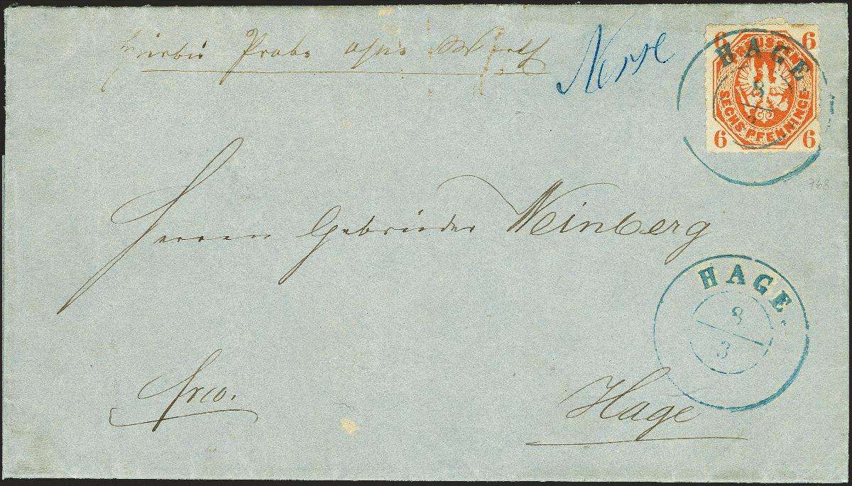 | Zusatzinformationen und Suchstichworte: | 380. Auktion Heinrich Köhler Auktionstermin 25.03.2023 Los 207 "HAAGE 8/3", blauer Hannover-Doppelkreisstempel sauber auf- und nebengesetzt auf Wappen 6 Pfennige orange, farbfrisch, etwas unregelmäßig durchstochen, sonst einwandfrei, auf komplettem Faltbrief mit handschriftlichem Aufgabevermerk der Briefsammlung "Nesse" sowie Vermerk "Hierbei Probe ohne Wert" nach Hage. Ein in dieser Form sehr seltener Briefsammlungs-Beleg. Signiert Metzer und Meier BPP, Fotoattest Jäschke-L. BPP (2023) Ausruf 400,00 EUR Zuschlag 500,00 EUR (aus der Sammlung Erivan Haub) |