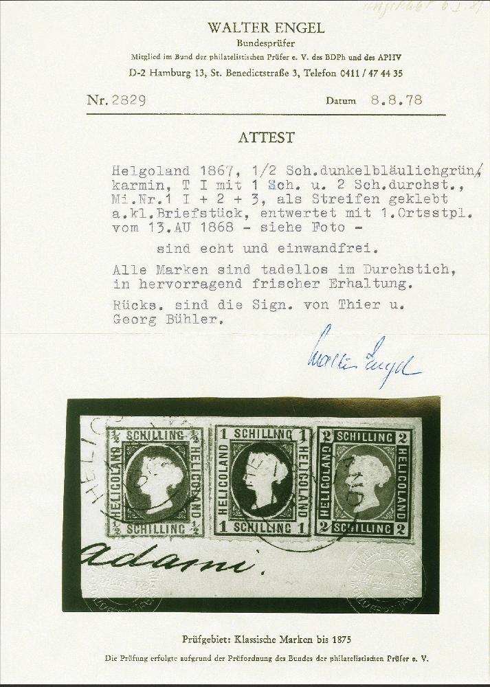 | Zusatzinformationen und Suchstichworte: | 380. Auktion Heinrich Köhler Auktionstermin 25.03.2023 Los 94 ½ Schilling, Type I, 1 Schilling und 2 Schilling, alle farbfrisch und ausgabetypisch bis gut durchstochen, als Streifen geklebt, mit leicht und sauber aufgesetztem Rundstempel "HELIGOLAND13 AU 1868" auf Briefstück. Die 2 Schilling minimale Tönung, sonst einwandfrei. Signiert Köhler und Thier, Fotoatteste Engel BPP (1978) und Heitmann BPP (2022) Ausruf 400,00 EUR Zuschlag 1.600,00 EUR (aus der Sammlung Erivan Haub) |