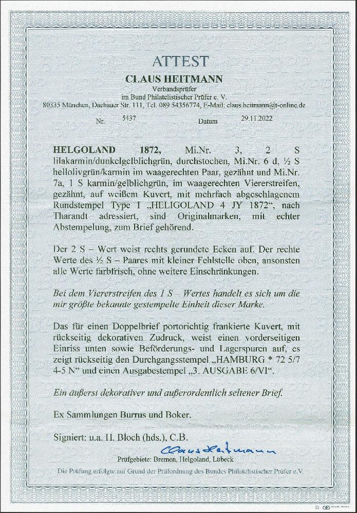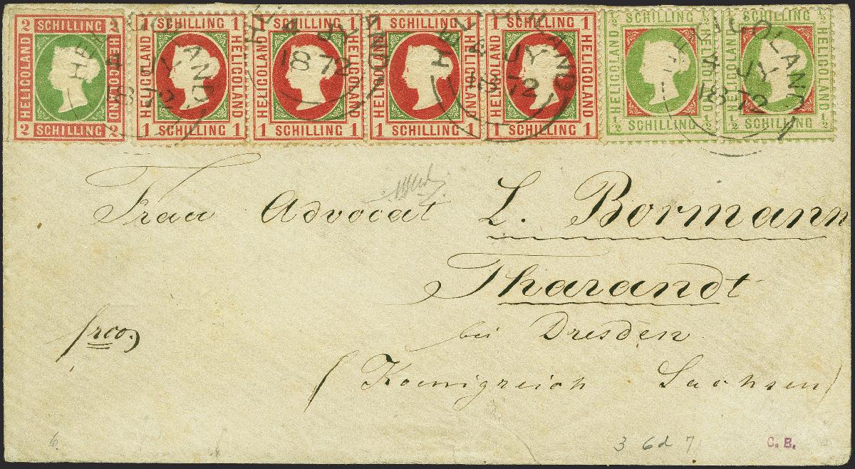 | Zusatzinformationen und Suchstichworte: | 380. Auktion Heinrich Köhler Auktionstermin 25.03.2023 Los 96 2 Schilling in Mischfrankatur mit gezähnter Ausgabe ½ Schilling hellolivgrün/karmin im waagerechten Paar und 1 S. karmin/gelblichgrün im Viererstreifen, alle farbfrisch, mit mehrfach sauber aufgesetztem Kreisstempel "HELIGOLAND 4JY 1872" auf Briefkuvert mit rückseitigem Reklamezudruck "KÖNIGLICH ENGLISCHE LANDES-APOTHEKE. AUF HELGOLAND" nach Dresden mit Durchgangsstempel von Hamburg und Ausgabestempel. Die 2 Schilling rechts leicht eckrund, eine ½ Schilling kleine Fehlstelle am Oberrand, sonst einwandfreie und frische Erhaltung, lediglich das Kuvert unten vorderseitig kleiner Einriss. Eine in dieser Form einmalige Farbfrankatur und einer der spektakulärsten Briefe der Helgoland-Philatelie. Fotoattest Heitmann BPP (2022). Ausruf 8.000,00 EUR Zuschlag 32.000,00 EUR (aus der Sammlung Erivan Haub) |