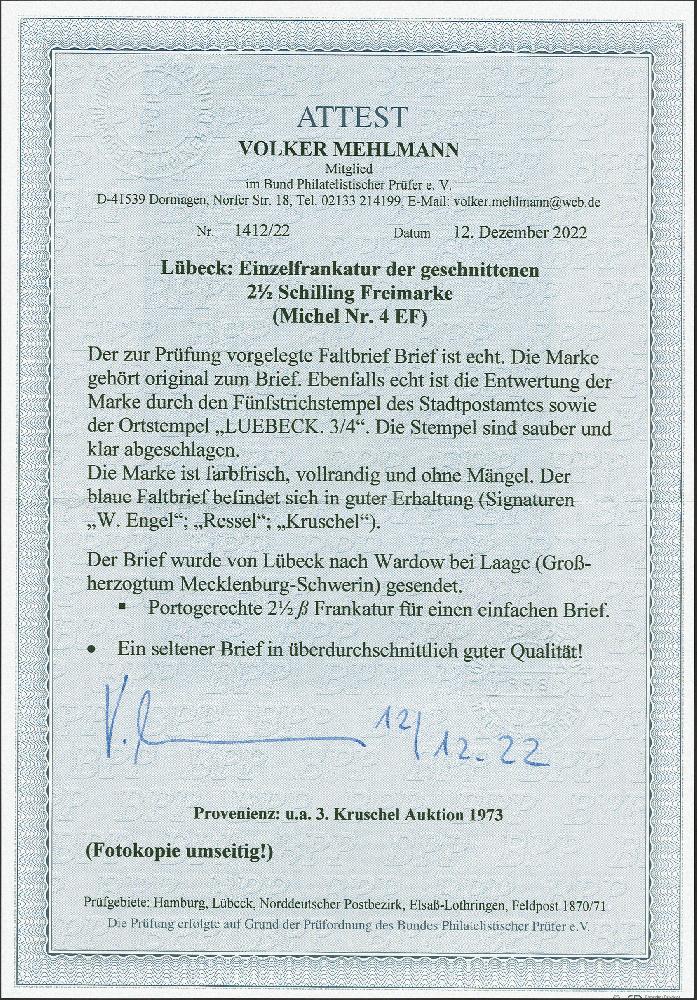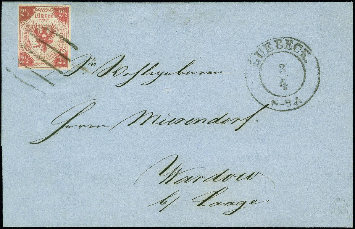 | Zusatzinformationen und Suchstichworte: | 380. Auktion Heinrich Köhler Auktionstermin 25.03.2023 Los 100 1859, 2½ Schilling mittelmagenta, farbfrisch und allseits voll- bis breitrandig, mit sauber aufgesetztem Strichstempel und leicht nebengesetztem Doppelkreisstempel "LUEBECK 3/4" auf Briefhülle nach Wardow bei Laage in Mecklenburg mit rückseitigem Bahnpoststempel. Eine sehr attraktive Einzelfrankatur in tadelloser Erhaltung. Fototattest Mehlmann BPP (2022) Ausruf 1.500,00 EUR Zuschlag 5.400,00 EUR (aus der Sammlung Erivan Haub) |
