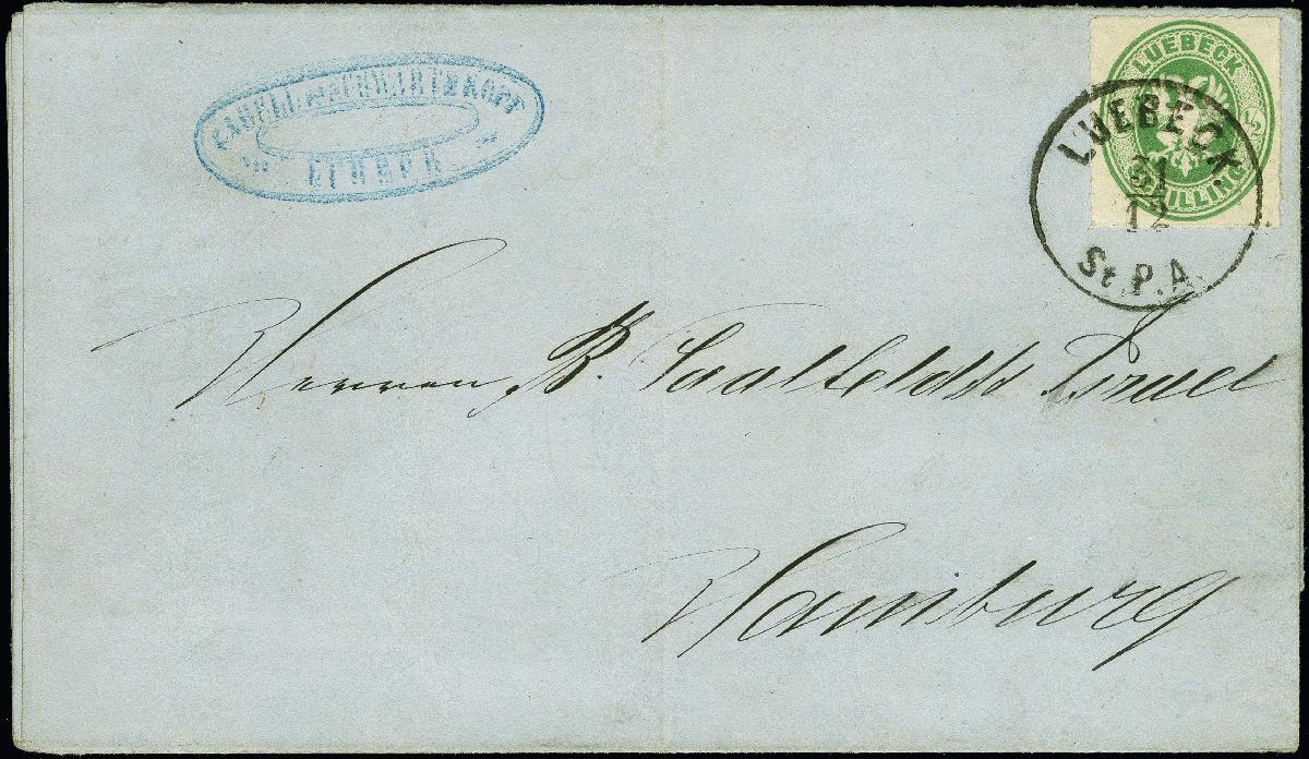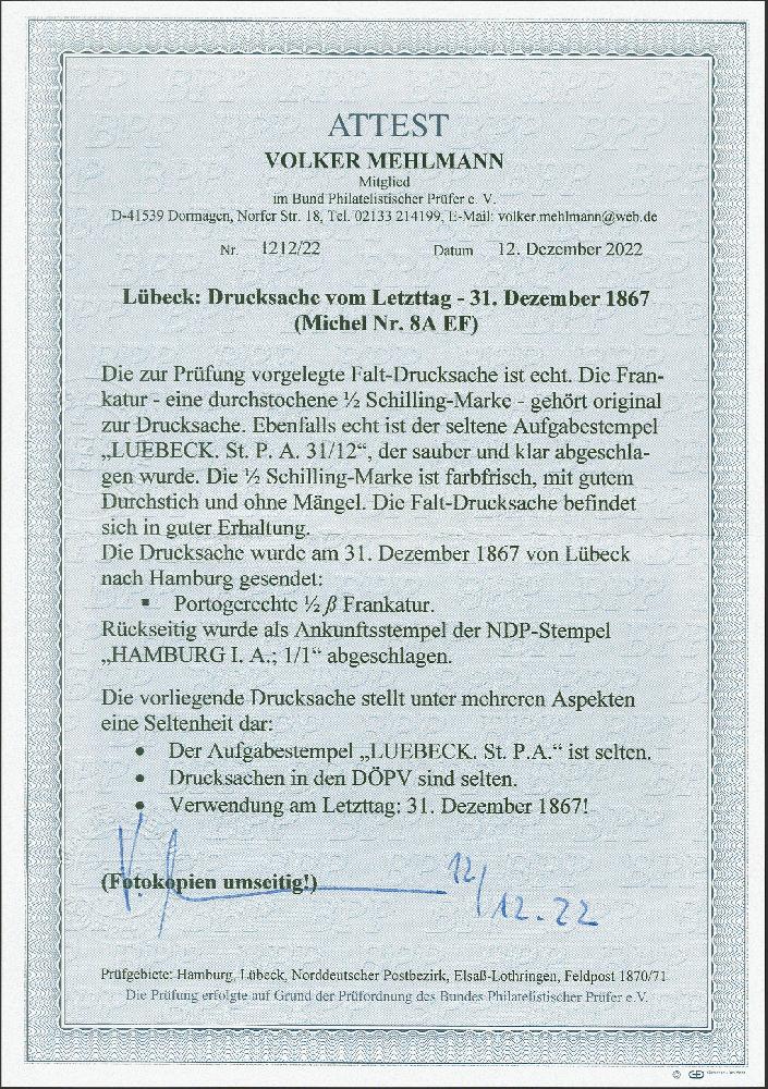 | Zusatzinformationen und Suchstichworte: | 380. Auktion Heinrich Köhler Auktionstermin 25.03.2023 Los 101 ½ Schilling dunkelgelblichgrün, farbfrisch und gut durchstochen, mit sauber aufgesetztem Letzttags-Stempel "LUEBECK St. P. A. 31/12" auf Drucksachenhülle nach Hamburg; rückseitig der an diesem Tage eingeführte neue NDP-Einkreisstempel "HAMBURG I.A. 1/1" (1868). Ein attraktiver und in dieser Form sehr seltener und interessanter Brief, der den Übergang in den Norddeutschen Postbezirk ganz besonders anschaulich dokumentiert. Fotoattest Mehlmann BPP (2022) Ausruf 500,00 EUR Zuschlag 900,00 EUR (aus der Sammlung Erivan Haub) |