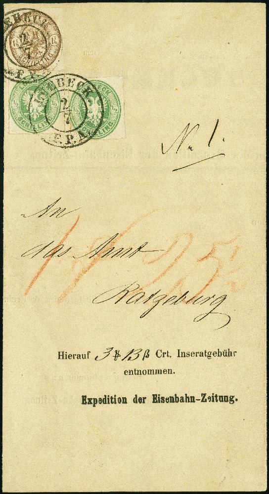 | Zusatzinformationen und Suchstichworte: | 380. Auktion Heinrich Köhler Auktionstermin 25.03.2023 Los 103 ½ Schilling grün, 2 Einzelwerte, beide farbfrisch und gut durchstochen, in Mischfrankatur mit 1864, Steindruck 1¼ Schilling dunkelbraun, voll- bis breitrandig, mit sauber aufgesetztem Doppelkreisstempel "LUEBECK F.P.A. 2/7" (1865) auf Postvorschuss-Brief der Eisenbahnzeitung nach Ratzeburg. Sehr schöne, frische und tadellose Erhaltung. Ein attraktives und seltenes Ganzstück. Fotoattest Mehlmann BPP (2022) Ausruf 1.000,00 EUR Zuschlag 2.200,00 EUR (aus der Sammlung Erivan Haub) |