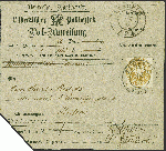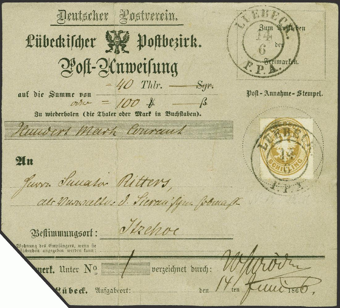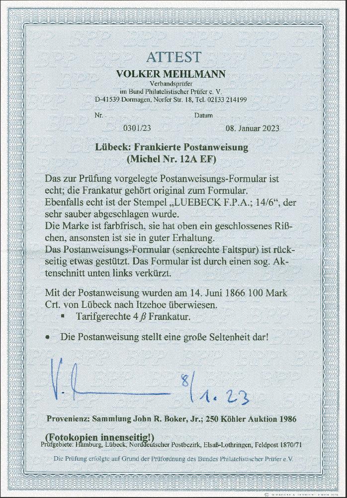 | Zusatzinformationen und Suchstichworte: | 380. Auktion Heinrich Köhler Auktionstermin 25.03.2023 Los 104 4 Schilling ocker, farbfrisch und gut durchstochen, mit sauber auf- und nebengesetztem Doppelkreisstempel "LUEBECK F.P.A. 14 6" (1866) auf Postanweisung über 100 Mark Courant, ohne Coupon, nach Itzehoe mit Ankunftsstempel und Auszahlungsvermerk. Ein senkrechter Bug im Formular gestützt, die Marke oben geschlossenes Rißchen, sonst einwandfrei. Es sind nur wenige frankierte Postanweisungen von Lübeck registriert, dies ist die einzige mit dieser Einzelfrankatur. Fotoattest Mehlmann BPP (2023) Ausruf 2.000,00 EUR Zuschlag 2.600,00 EUR (aus der Sammlung Erivan Haub) |