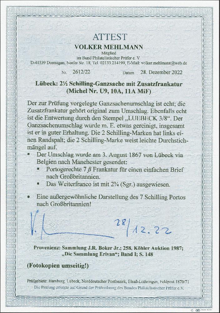 | Zusatzinformationen und Suchstichworte: | 380. Auktion Heinrich Köhler Auktionstermin 25.03.2023 Los 106 1864, Umschlag 2½ Schilling ultramarin mit Zufrankatur 2 Schilling rosa und 2½ Schilling ultramarin, mit sauber aufgesetztem Doppelkreisstempel "LÜBECK 3/8"(1867) nach Manchester mit ausgewiesenem Weiterfranko von "2 ¾" Silbergroschen und vorderseitigem Ankunftsstempel. Die Zufrankatur geringe Randfehler, sonst einwandfreie und frische Erhaltung. Eine außerordentlich seltene und dekorative Frankatur-Kombination. Fotoattest Mehlmann BPP (2022) Ausruf 1.500,00 EUR Zuschlag 2.600,00 EUR (aus der Sammlung Erivan Haub) |