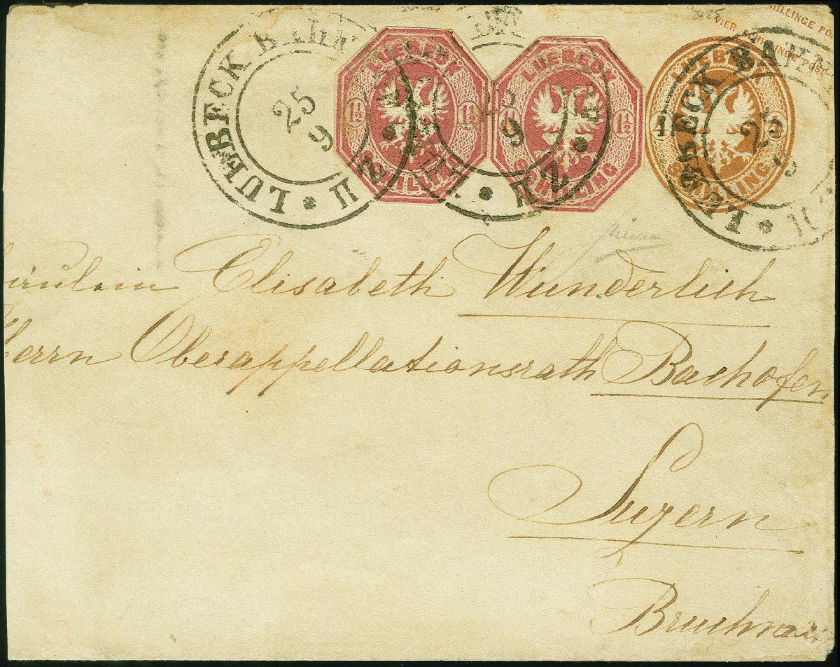 | Zusatzinformationen und Suchstichworte: | 380. Auktion Heinrich Köhler Auktionstermin 25.03.2023 Los 107 Ganzsachenausschnitt 1½ Schilling bräunlichlila, 2 Stück, beide achteckig geschnitten, als Zufrankatur auf Ganzsachenumschlag 4 Schilling ocker (links stark beschnitten), mit sauber aufgesetztem Doppelkreisstempel "LUEBECK BAHNH. IIZ 25/9" nach Luzern in der Schweiz mit rückseitigen Bahnpost- und Ankunftsstempeln. Das Stück ist etwas gereinigt und Öffnungsspuren teilweise geschlossen, sonst einwandfrei. Ganzsachenausschnitte als Zufrankatur von Lübeck sind äußerst selten; vom 1½ Schilling-Ausschnitt haben wir kein weiteres Ganzstück registriert. Signiert Hunziker und Ebel, Fotoattest Mehlmann BPP (2022) Ausruf 5.000,00 EUR Zuschlag 5.000,00 EUR (aus der Sammlung Erivan Haub) |
