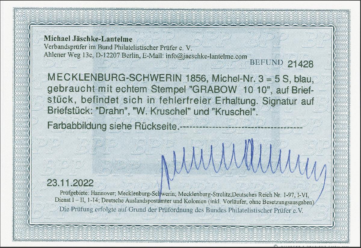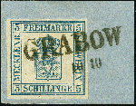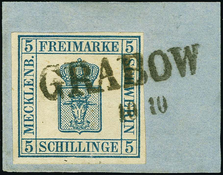 | Zusatzinformationen und Suchstichworte: | 380. Auktion Heinrich Köhler Auktionstermin 25.03.2023 Los 110 1856, 5 Schillinge blau, farbfrisch und voll- bis breitrandig, mit klar aufgesetztem Langstempel "GRABOW 10 10" auf Briefstück. Sehr schöne und tadellose Erhaltung. Signiert Drahn und Kruschel, Fotobefund Jäschke-L. BPP BPP (2022) Ausruf 200,00 EUR Zuschlag 1.000,00 EUR (aus der Sammlung Erivan Haub) |