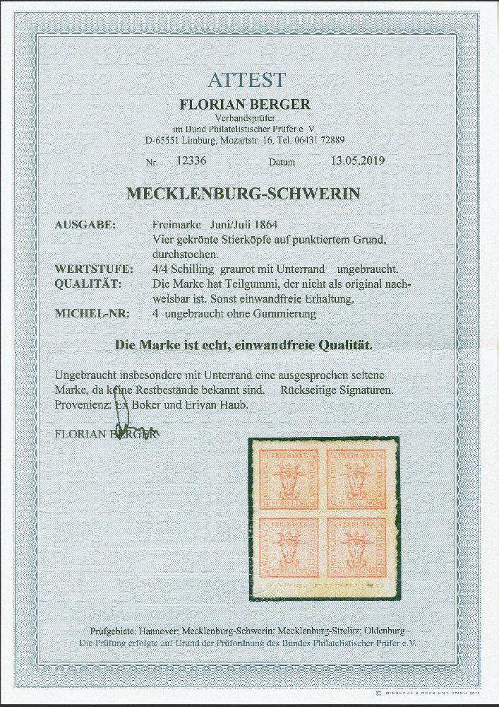 | Zusatzinformationen und Suchstichworte: | 380. Auktion Heinrich Köhler Auktionstermin 25.03.2023 Los 112 1864, durchstochen: 4/4 Schilling graurot, unten mit schmalem Bogenrand, farbfrisch und einwandfrei durchstochen, ungebraucht mit Gummiresten. Eine seltene Marke in einwandfreier Erhaltung. Private Signaturen, Fotoattest Jäschke-L. BPP (2022) Ausruf 500,00 EUR Zuschlag 2.100,00 EUR (aus der Sammlung Erivan Haub) |