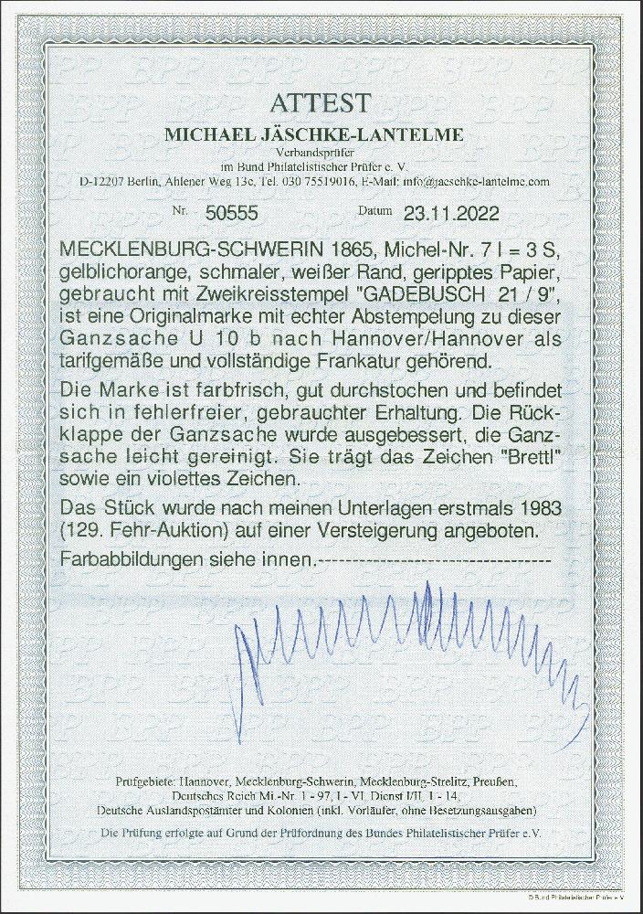 | Prüfer: | Jäschke-Lantelme, Michael (BPP (Bund Philatelistischer Prüfer)) |