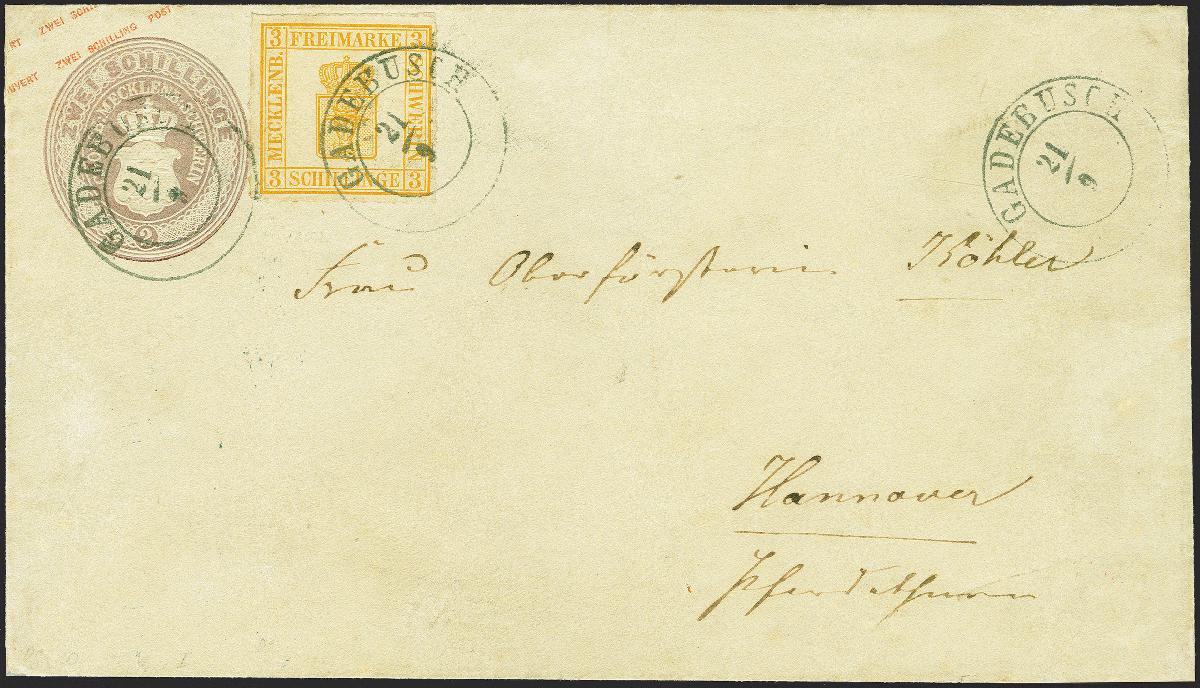 | Zusatzinformationen und Suchstichworte: | 380. Auktion Heinrich Köhler Auktionstermin 25.03.2023 Los 116 1864, Umschlag 2 Schillinge violett mit Zufrankatur 1865, 3 Schillinge gelblichorange, schmaler Rand, farbfrisch und gut durchstochen, mit auf Wertstempel, Marke und nebengesetztem abgeschlagenem Doppelkreisstempel "GADEBUSCH 21/9" nach Hannover. Die beim Öffnen zerrissene Verschlussklappe ausgebessert und die Ganzsache leicht gereinigt, sonst einwandfrei. Eine sehr attraktive und außerordentlich seltene Frankaturkombination, die wir nur ein weiteres mal registriert haben. Signiert Brettl und Fotoattest Jäschke-L. BPP (2022) Ausruf 1.000,00 EUR Zuschlag 1.500,00 EUR (aus der Sammlung Erivan Haub) |