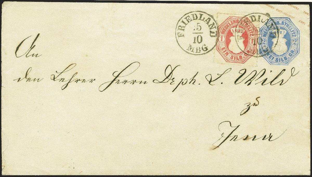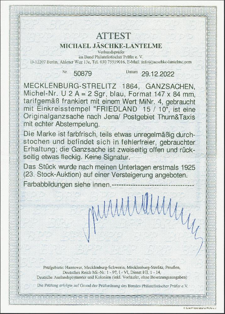 | Zusatzinformationen und Suchstichworte: | 380. Auktion Heinrich Köhler Auktionstermin 25.03.2023 Los 123 1 Silbergroschen rosa, farbfrisch, teils etwas unregelmäßig durchstochen, als Zufrankatur auf Ganzsachenumschlag 2 Silbergroschen ultramarin, mit Einkreisstempel "FRIEDLAND MBG 15/10" (1865) nach Jena. Die Ganzsache rückseitig etwas fleckig und zweiseitig geöffnet, sonst einwandfrei. Eine attraktive und seltene Frankaturkombination. Fotoattest Jäschke-L. BPP Ausruf 1.000,00 EUR Zuschlag 2.600,00 EUR (aus der Sammlung Erivan Haub) |