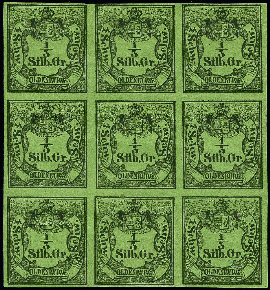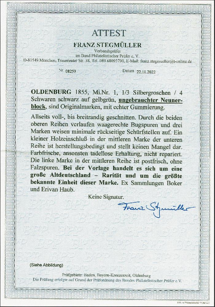 | Zusatzinformationen und Suchstichworte: | 380. Auktion Heinrich Köhler Auktionstermin 25.03.2023 Los 124 ⅓ Sgr. auf grün im 9er-Block, voll- bis breitrandig und in schöner frischer Farbe, ungebraucht mit Originalgummi. Die Einheit wurde einmal waagerecht vorgefaltet, den Unterrand der oberen Reihe leicht berührend; durch die mittlere Reihe verläuft eine leichte waagerechte Bugspur, 3 Werte rückseitig minimale Schürfungen. Insgesamt frische und sonst einwandfreie Erhaltung. Dies ist die größte bekannte Einheit dieser Marke und als solche ein Unikat. Eine der großen Ungebraucht-Seltenheiten Altdeutschlands. Fotoattest Stegmüller BPP (2022) Ausruf 20.000,00 EUR Zuschlag 125.000,00 EUR (aus der Sammlung Erivan Haub) |