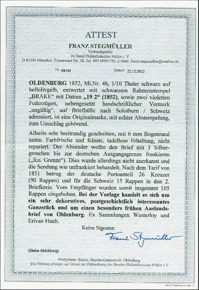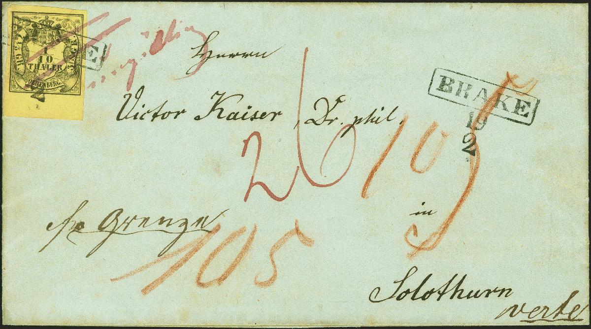 | Zusatzinformationen und Suchstichworte: | 380. Auktion Heinrich Köhler Auktionstermin 25.03.2023 Los 126 1/10 Thaler auf zitrongelb, frische leuchtende Farbe und allseits breitrandig, unten mit 6 mm Bogenrand, mit sauber auf- und nebengesetztem schwarzen Rahmenstempel "BRAKE 19 2" (1852) auf Briefhülle nach Solothurn in der Schweiz mit rückseitigem Durchgangsstempel des Taxis'schen Postamtes von Bremen und rotem Durchgangsstempel von Basel. Der Absender wollte den Brief mit 3 Silbergroschen bis zur Postvereinsgrenze vorauszahlen (handschriftlich "fco. Grenze"), dies wurde allerdings nicht anerkannt, die Marke mit roter Tinte durchgestrichen und als "ungültig" markiert. Die Sendung wurde wie unfrankiert behandelt und insgesamt mit "105" Rappen belastet, die vom Empfänger eingezogen wurden. Ein attraktiver und außerordentlich seltener Auslandsbrief. Fotoattest Stegmüller BPP (2022) Ausruf 1.000,00 EUR Zuschlag 5.200,00 EUR (aus der Sammlung Erivan Haub) |