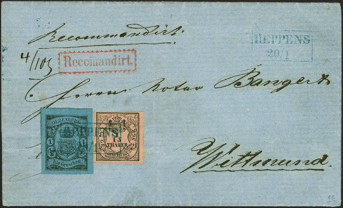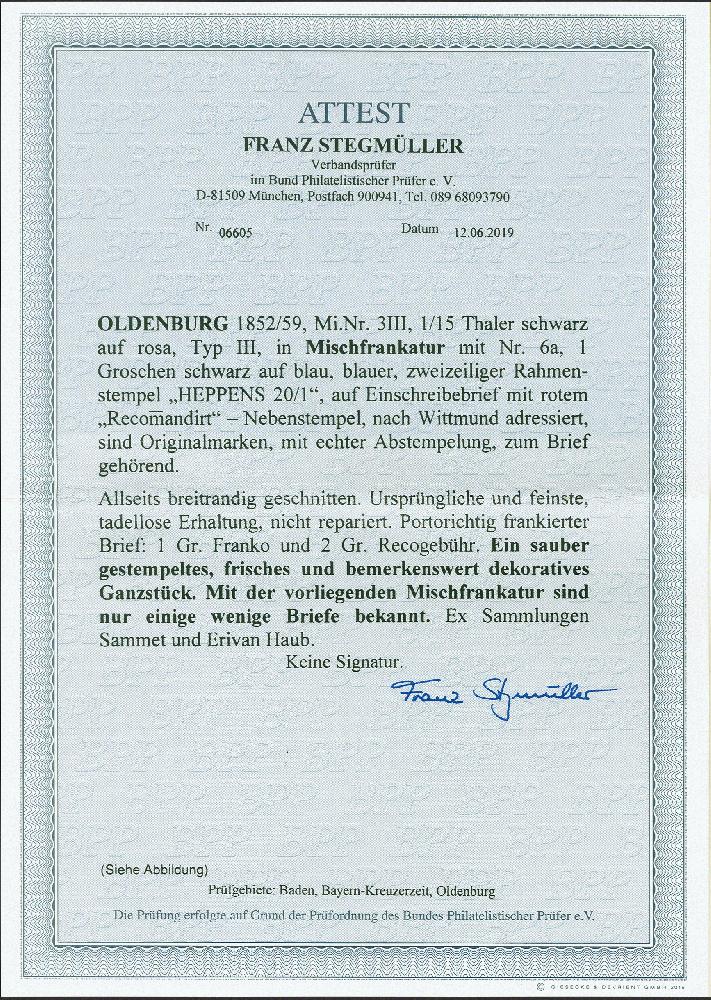 | Zusatzinformationen und Suchstichworte: | 380. Auktion Heinrich Köhler Auktionstermin 25.03.2023 Los 127 1/15 Thaler schwarz auf rosa, Type III, in Mischfrankatur mit 1859, 1 Groschen schwarz auf blau, beide farbfrisch und breitrandig, mit sauber auf- und nebengesetztem Rahmenstempel "HEPPENS 20/1" und nebengesetztem Zackenkranzstempel "Recommandirt" auf komplettem Faltbrief nach Wittmund. Sehr schöne, ursprüngliche und tadellose Erhaltung. Die wohl schönste Mischfrankatur Oldenburgs. Fotoatteste Brettl/Schmitt (1984) sowie Stegmüller BPP (2019) Ausruf 3.000,00 EUR Zuschlag 25.000,00 EUR (aus der Sammlung Erivan Haub) |