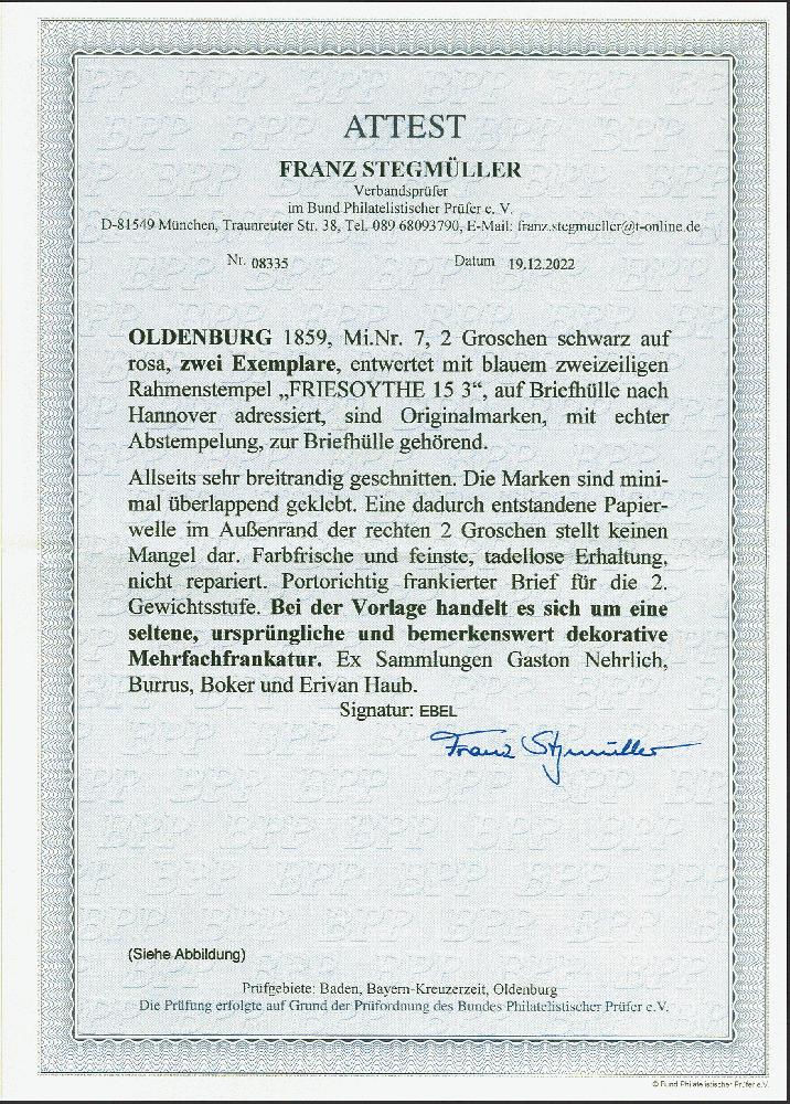 | Zusatzinformationen und Suchstichworte: | 380. Auktion Heinrich Köhler Auktionstermin 25.03.2023 Los 128 2 Groschen auf rosa, 2 Einzelwerte in schöner frischer Farbe und beide sehr breitrandig geschnitten, mit leicht auf- und nebengesetztem Rahmenstempel "FRIESOYTHE 15/3" auf Briefhülle der 2. Gewichtsstufe nach Hannover. Sehr frische und tadellose Erhaltung. Der wohl schönste und hochwertigste Brief mit dieser sehr seltenen Frankatur. Signiert Ebel, Fotoattest Stegmüller BPP (2022) Ausruf 5.000,00 EUR Zuschlag 10.500,00 EUR (aus der Sammlung Erivan Haub) |