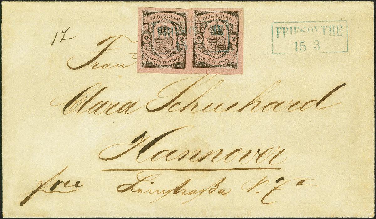 | Zusatzinformationen und Suchstichworte: | 380. Auktion Heinrich Köhler Auktionstermin 25.03.2023 Los 128 2 Groschen auf rosa, 2 Einzelwerte in schöner frischer Farbe und beide sehr breitrandig geschnitten, mit leicht auf- und nebengesetztem Rahmenstempel "FRIESOYTHE 15/3" auf Briefhülle der 2. Gewichtsstufe nach Hannover. Sehr frische und tadellose Erhaltung. Der wohl schönste und hochwertigste Brief mit dieser sehr seltenen Frankatur. Signiert Ebel, Fotoattest Stegmüller BPP (2022) Ausruf 5.000,00 EUR Zuschlag 10.500,00 EUR (aus der Sammlung Erivan Haub) |