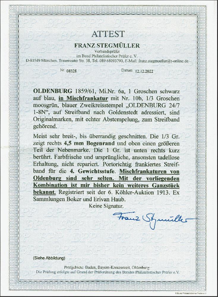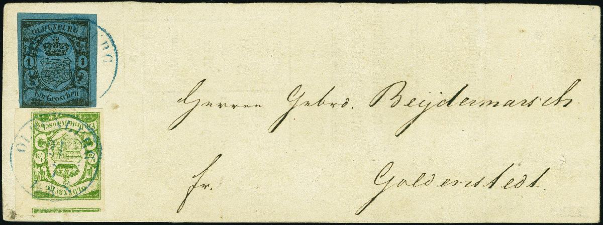 | Zusatzinformationen und Suchstichworte: | 380. Auktion Heinrich Köhler Auktionstermin 25.03.2023 Los 133 ⅓ Groschen moosgrün, ein phänomenales Stück, farbfrisch und allseits breit- bis überrandig, rechts mit ca. 4,5 mm Bogenrand und oben mit Teil der Nachbarmarke, in Mischfrankatur mit 2. Ausgabe 1 Groschen auf blau in sehr tiefer Farbe, unten rechts kurz berührt, sonst voll- bis breitrandig, mit jeweils leicht aufgesetztem blauem Doppelkreisstempel "OLDENBURG 24/7" auf Streifband der 4. Gewichtsstufe nach Goldenstedt bei Vechta mit Ankunftsstempel. Sehr schöne und tadellose Erhaltung. Die wohl spektakulärste Mischfrankatur Oldenburgs, die einzig registrierte einer ⅓ Groschen-Marke auf Brief und die einzige Drucksache Oldenburgs der 4. Gewichtsstufe. Fotoattest Stegmüller BPP (2022) Ausruf 30.000,00 EUR Zuschlag 90.000,00 EUR (aus der Sammlung Erivan Haub) |