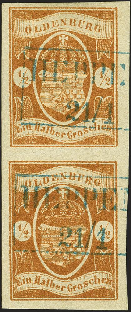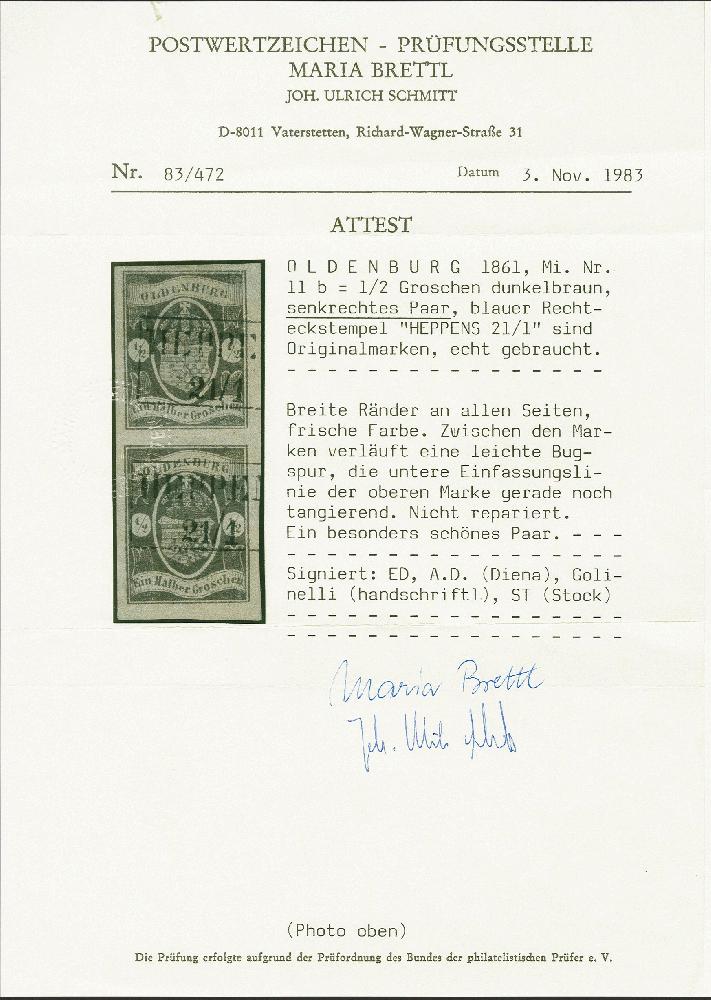 | Zusatzinformationen und Suchstichworte: | 380. Auktion Heinrich Köhler Auktionstermin 25.03.2023 Los 134 ½ Gr. orangebraun im senkrechten Paar, farbfrisch und allseits breitrandig, sehr schön entwertet durch jeweils klar und gerade aufgesetzten blauen Rahmenstempel "HEPPENS 21/1". Eine unmerkliche waagerechte Bugspur im Zwischenraum berührt die obere Marke minimal, sonst tadellos. Ein sehr attraktives und seltenes Paar. Signiert Stock und Alberto Diena, Fotoattest Stegmüller BPP (2022) Ausruf 500,00 EUR Zuschlag 1.100,00 EUR (aus der Sammlung Erivan Haub) |