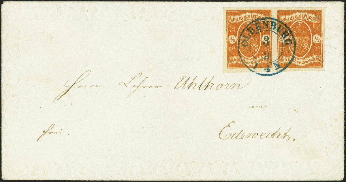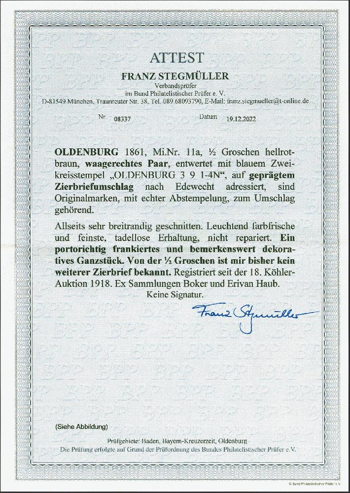 | Zusatzinformationen und Suchstichworte: | 380. Auktion Heinrich Köhler Auktionstermin 25.03.2023 Los 135 ½ Groschen hellrotbraun im waagerechten Paar, farbfrisch und allseits breitrandig, sehr schön entwertet durch glasklaren blauen Doppelkreisstempel "OLDENBURG 3/9"auf weißem Briefkuvert mit farblos geprägter Zierborde nach Edewecht mit Transit- und Ankunftsstempeln. Besonders schöne und tadellose Erhaltung. Zierbriefe von Oldenburg sind außerordentlich selten; ein ausnehmend schöner Brief der 3. Ausgabe. Fotoattest Stegmüller BPP (2022) Ausruf 5.000,00 EUR Zuschlag 8.500,00 EUR (aus der Sammlung Erivan Haub) |