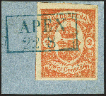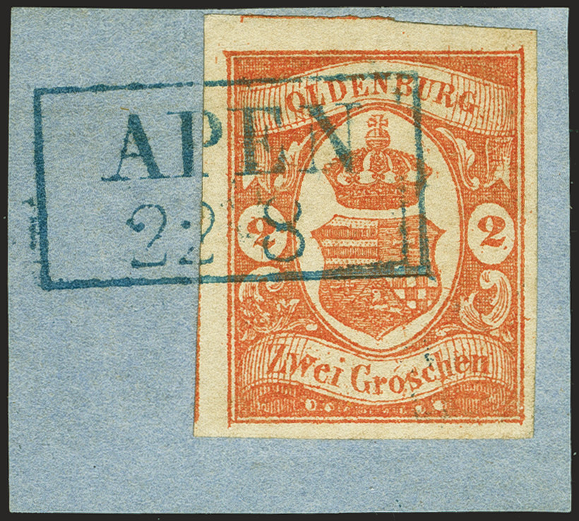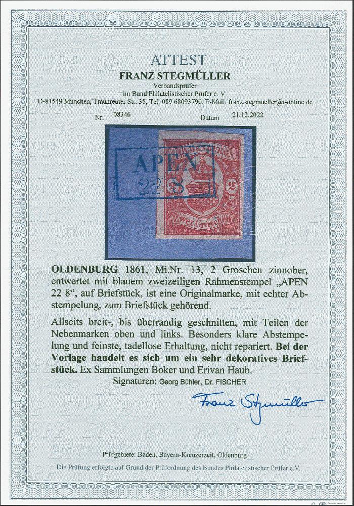 | Zusatzinformationen und Suchstichworte: | 380. Auktion Heinrich Köhler Auktionstermin 25.03.2023 Los 136 2 Groschen zinnober, farbfrisch und breit- bis überrandig mit Teilen von 2 Nachbarmarken, mit glasklar aufgesetztem blauen Rahmenstempel "APEN 22 8" auf Briefstück, tadellos. Signiert Bühler und Dr. Fischer, Fotoattest Stegmüller BPP (2022) Ausruf 150,00 EUR Zuschlag 460,00 EUR (aus der Sammlung Erivan Haub) |