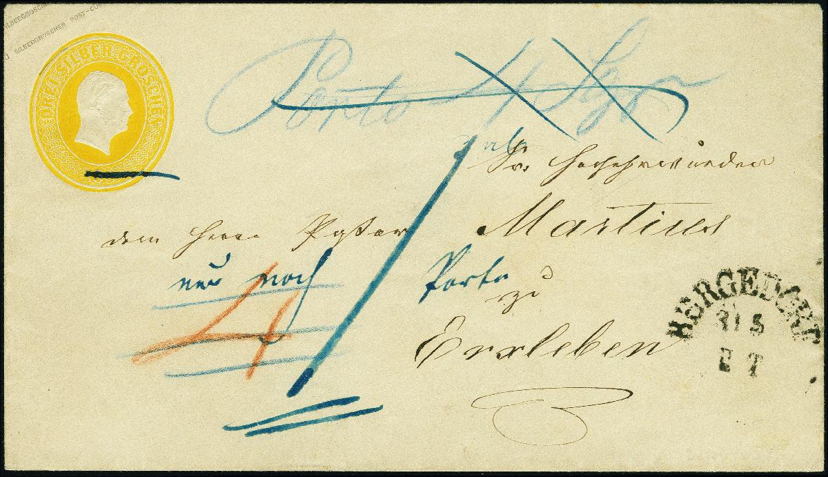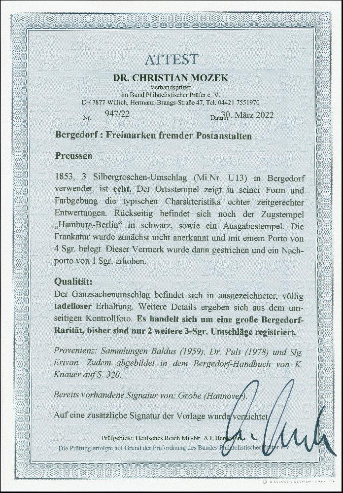 | Zusatzinformationen und Suchstichworte: | 380. Auktion Heinrich Köhler Auktionstermin 25.03.2023 Los 51 Preußen Ganzsachenumschlag 3 Silbergroschen gelb mit nebengesetztem Bogenstempel "BERGEDORF 31 5 II T" nach Erxleben in Sachsen-Anhalt mit rückseitigem Bahnpost- und Ausgabestempel. Der Brief wurde zunächst als mit "4" Schilling bezahlt gekennzeichnet, diese Notiz dann aber durch Postmeister Paalzow wieder gestrichen, in blau notiert "Porto 4 Sgr" und der Brief spediert. In Preußen wurde die Porto-Notiz wieder gestrichen und "nur noch 1 (Silbergroschen) Porto" vermerkt, dem Differenzbetrag zwischen der an Bergedorf gezahlten Porto-Forderung und dem "verklebten" preußischen Franko. Ein sehr seltener und interessanter Brief von großer Seltenheit, es sind nur zwei weitere 3 Silbergroschen-Umschläge aus Bergedorf registriert. Fotoattest Dr. Mozek BPP (2022) Ausruf 3.000,00 EUR Zuschlag 12.000,00 EUR (aus der Sammlung Erivan Haub) |