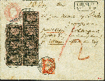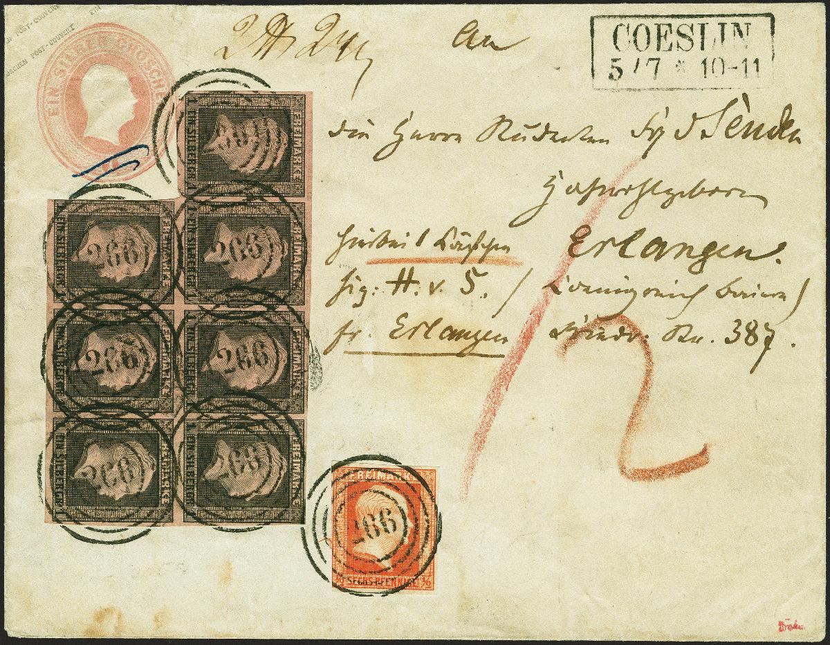 | Zusatzinformationen und Suchstichworte: | 380. Auktion Heinrich Köhler Auktionstermin 25.03.2023 Los 156 1 Silbergroschen auf hellgraurot im waagerechten 7er-Block, zusammen mit ½ Silbergroschen rotorange, mit Nr. "266" und sauber nebengesetztem Rahmenstempel "COESLIN 5/7" auf Ganzsachenumschlag 1 Silbergroschen rosa im Großformat, als Paketbegleitbrief nach Erlangen. Die ½ Silbergroschen links unten berührt, das Blockstück an zwei Stellen minimal, sonst alle voll- bis breitrandig und farbfrisch; die Ganzsache mit leichten Alters- bzw. Beförderungsspuren, ein Teil der Verschlussklappe fehlt. Ein phänomenales Stück mit der größten registrierten Einheit der 1 Silbergroschen auf Brief und in dieser Form Unikat. Signiert Drahn, Kruschel und Metzer, Fotoattest Jäschke-L. BPP (2023) Ausruf 5.000,00 EUR Zuschlag 19.000,00 EUR (aus der Sammlung Erivan Haub) |