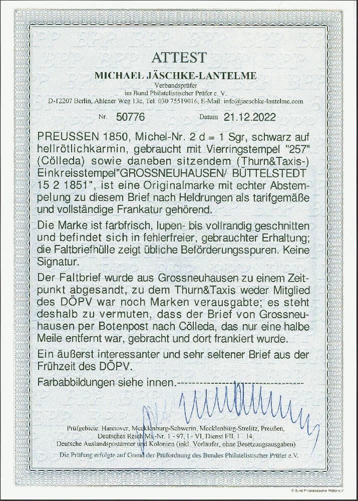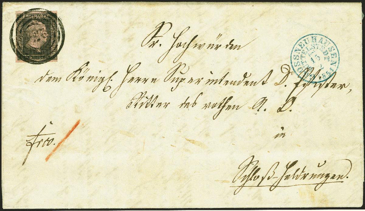 | Zusatzinformationen und Suchstichworte: | 380. Auktion Heinrich Köhler Auktionstermin 25.03.2023 Los 158 1 Silbergroschen auf lilarosa, farbfrisch und voll- bis breitrandig, mit Nr. "257" CÖLLEDA und nebengesetztem blauem Taxis-Einkreisstempel "GROSSNEUHAUSEN bei BUTTELSTEDT 15 2 1851" auf komplettem Faltbrief nach Heldrungen mit Ausgabestempel. Thurn und Taxis war zu dieser Zeit weder Mitglied im Postverein, noch hatte es eigene Marken verausgabt. Wahrscheinlich wurde der Brief von Grossneuhausen mit Botenpost nach Kölleda gebracht und hier bei der preußischen Post aufgegeben. Ein interessanter und seltener Brief aus der Frühzeit des Postvereins. Fotoattest Jäschke-L. BPP (2022) Ausruf 400,00 EUR Zuschlag 520,00 EUR (aus der Sammlung Erivan Haub) |