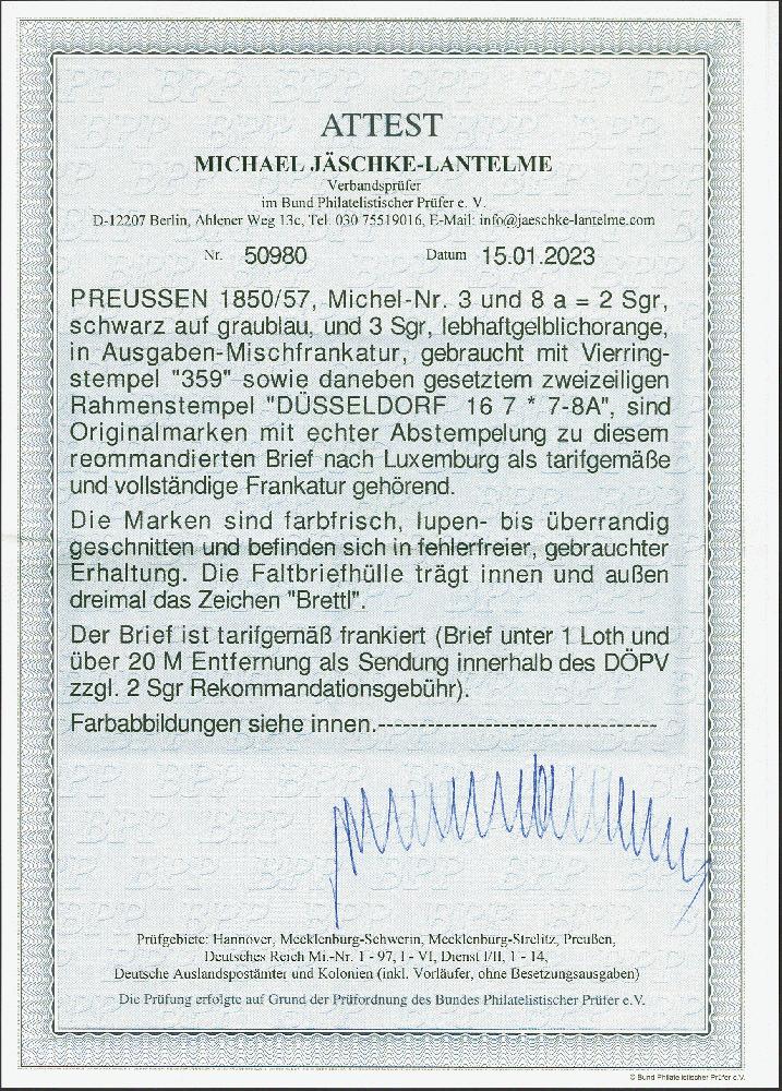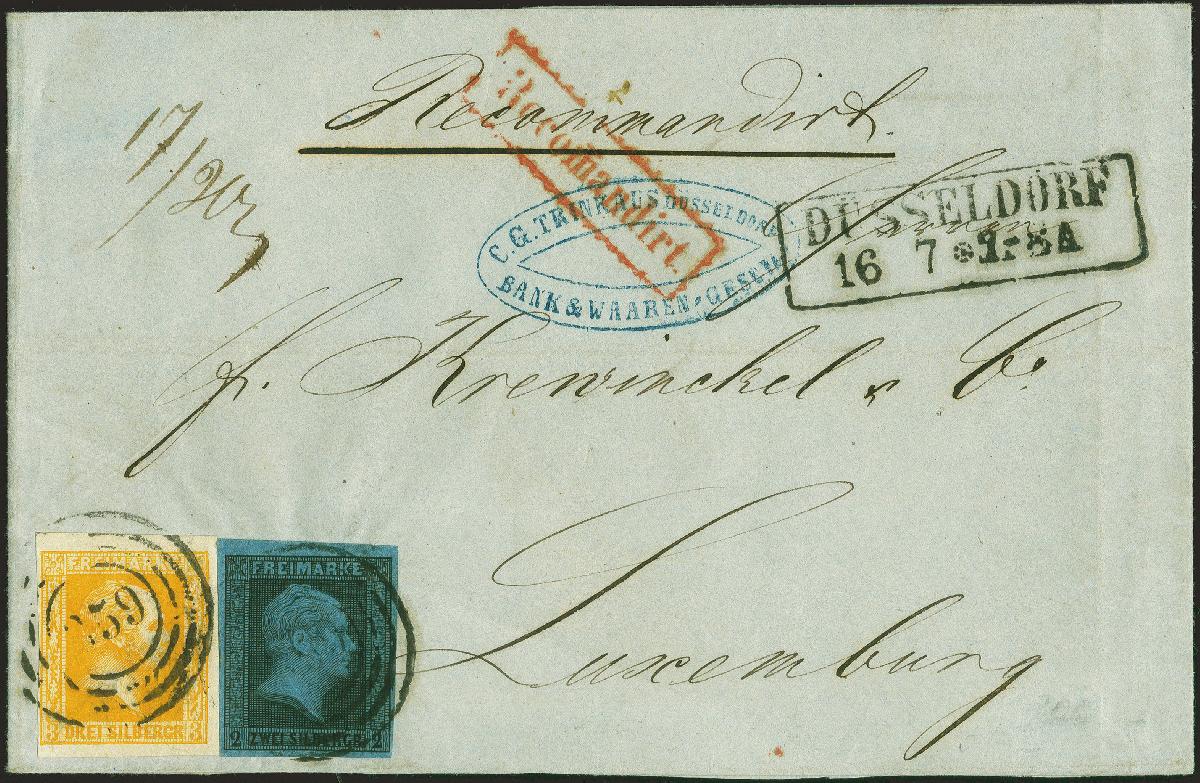 | Zusatzinformationen und Suchstichworte: | 380. Auktion Heinrich Köhler Auktionstermin 25.03.2023 Los 163 2 Silbergroschen auf blau in Mischfrankatur mit glatter Grund 3 Silbergroschen lebhaftgelblichorange, beide farbfrisch und noch voll- bis sehr breitrandig, mit Nr. "359" und nebengesetztem Rahmenstempel "DÜSSELDORF 16 7" auf Chargé-Briefhülle nach Luxemburg mit Ankunftsstempel. Ein seltener Brief. Signiert Brettl und Fotoattest Jäschke-L. BPP (2023) Ausruf 200,00 EUR Zuschlag 440,00 EUR (aus der Sammlung Erivan Haub) |