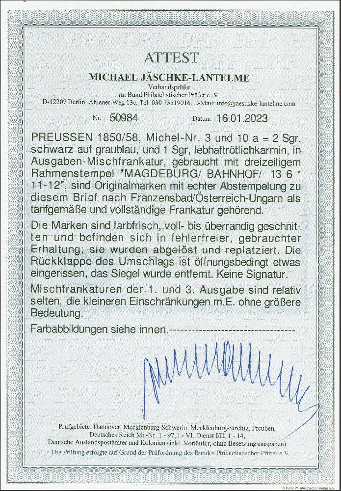 | Zusatzinformationen und Suchstichworte: | 380. Auktion Heinrich Köhler Auktionstermin 25.03.2023 Los 164 2 Silbergroschen auf blau in Mischfrankatur mit Gittergrund 1 Silbergroschen rosa, beide farbfrisch und voll- bis überrandig, mit Rahmenstempel "MAGDEBURG BAHNHOF 13 6" auf kleinem Briefkuvert nach Franzensbad bei Eger, Kaiserreich Österreich. Die Frankatur war zur Kontrolle gelöst, einwandfrei. Ein attraktiver Brief mit seltener Mischfrankatur und auf der 2 Silbergroschen seltener Ortsstempelentwertung. Fotoattest Jäschke-L. BPP (2023) Ausruf 300,00 EUR Zuschlag 340,00 EUR (aus der Sammlung Erivan Haub) |