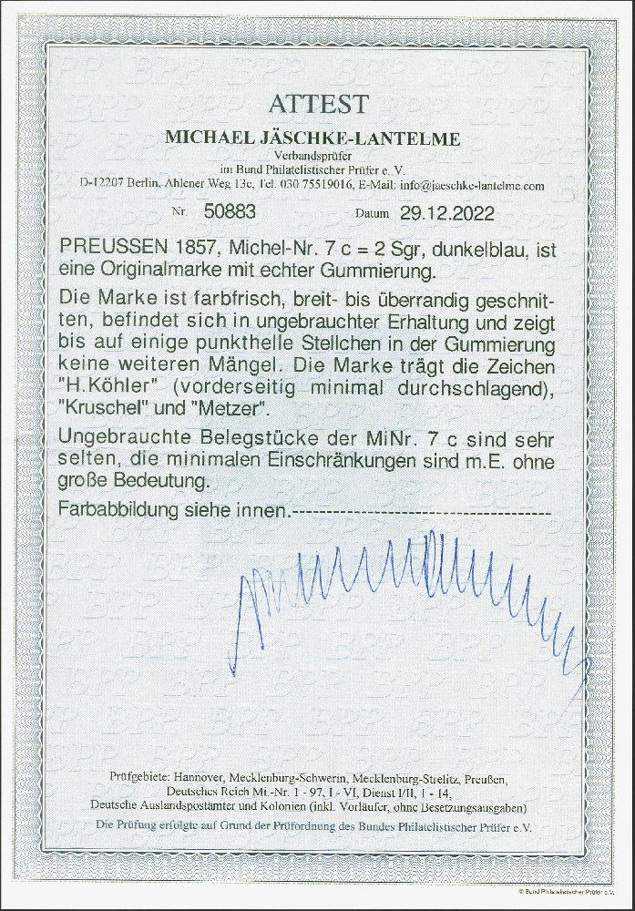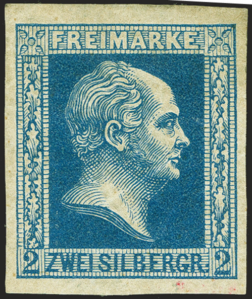 | Zusatzinformationen und Suchstichworte: | 380. Auktion Heinrich Köhler Auktionstermin 25.03.2023 Los 166 2 Silbergroschen dunkelblau in frischer, tiefer Farbe, allseits breitrandig, ungebraucht mit frischem Originalgummi. Einige punkthelle Stellchen in der Gummierung, sonst tadellos. Ungebrauchte Exemplare dieser Nuance sind große Seltenheiten, wir haben nur ein weiteres Stück registriert, dieses jedoch mit nicht originalem Gummi. Signiert Köhler (minimal durchschlagend), Kruschel und Metzer, Fotoattest Jäschke-L. BPP (2022) Ausruf 1.000,00 EUR Zuschlag 7.000,00 EUR (aus der Sammlung Erivan Haub) |