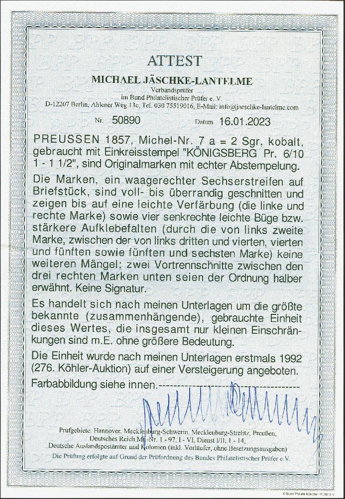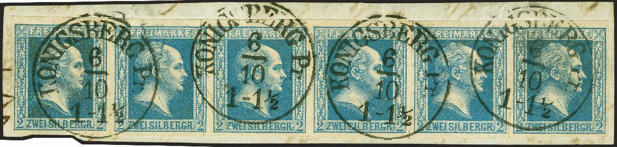 | Zusatzinformationen und Suchstichworte: | 380. Auktion Heinrich Köhler Auktionstermin 25.03.2023 Los 169 2 Silbergroschen blau im waagerechten 6er-Streifen, die äußeren Werte gering verfärbt, sonst farbfrisch und voll- bis überrandig geschnitten, mit viermal klar aufgesetztem Einkreisstempel "KÖNIGSBERG Pr. 6/10" auf Briefstück. Zwischen den Marken teils vorgefaltet, 2 Werte mit unauffälligen Aufklebefalten, sonst einwandfrei (2 Vortrennschnitte außerhalb der Markenbilder). Ein attraktives Stück von großer Seltenheit; die größte bekannte gebrauchte Einheit dieser Marke von der wir keine weitere registriert haben. Fotoattest Jäschke-L. BPP (2023) Ausruf 4.000,00 EUR Zuschlag (aus der Sammlung Erivan Haub) |