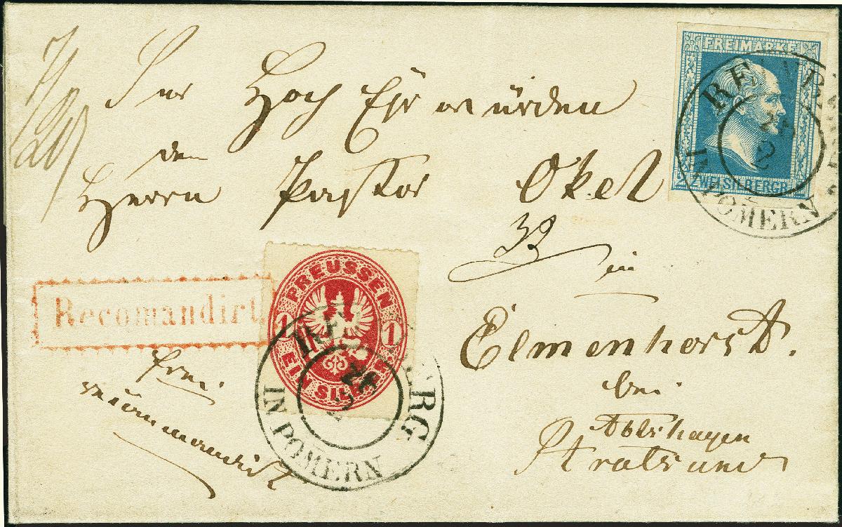 | Zusatzinformationen und Suchstichworte: | 380. Auktion Heinrich Köhler Auktionstermin 25.03.2023 Los 172 2 Silbergroschen blau in Mischfrankatur mit Wappen 1 Silbergroschen rosa, beide farbfrisch und voll- bis breitrandig geschnitten bzw. einwandfrei durchstochen, mit jeweils sauber aufgesetztem Doppelkreisstempel "REINBERG IN POMMERN 26 2" auf recommandirter Briefhülle nach Elmenhorst bei Stralsund. Eine besonders schöne und seltene Mischfrankatur in tadelloser Erhaltung. Fotoattest Jäschke-L. BPP (2023) Ausruf 400,00 EUR Zuschlag 1.100,00 EUR (aus der Sammlung Erivan Haub) |