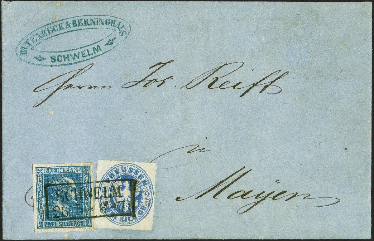 | Zusatzinformationen und Suchstichworte: | 380. Auktion Heinrich Köhler Auktionstermin 25.03.2023 Los 180 2 Silbergroschen grauultramarin, farbfrisch und voll- bis breitrandig, in wertstufengleicher Mischfrankatur mit Wappen 2 Silbergroschen dunkelultramarin, mit sauber aufgesetztem Rahmenstempel "SCHWELM 26/5" auf Briefhülle nach Mayen. Bei der Kopfmarke der Unterdruck minimal hervortretend, sonst tadellos (die Briefhülle leicht gereinigt). Eine seltene und sehr attraktive Frankatur. Fotoattest Jäschke-L. BPP (2023) Ausruf 500,00 EUR Zuschlag 600,00 EUR (aus der Sammlung Erivan Haub) |