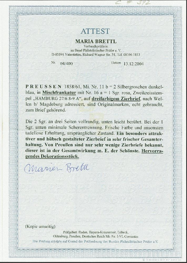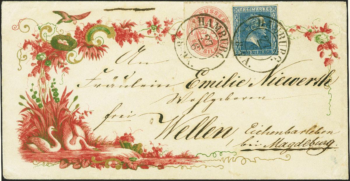 | Zusatzinformationen und Suchstichworte: | 380. Auktion Heinrich Köhler Auktionstermin 25.03.2023 Los 181 2 Silbergroschen grauultramarin, unten leicht berührt, sonst voll- bis breitrandig, in Mischfrankatur mit Wappenausgabe 1 Silbergroschen rosa, unten kurz Scherentrennung, sonst gut durchstochen und farbfrisch, mit jeweils klar aufgesetztem Doppelkreisstempel "HAMBURG 27/6" auf prachtvollem Zierumschlag, vorder- und rückseitig reich bedruckt in rot, grün und gold, adressiert nach Wellen bei Magdeburg mit rückseitigem Ausgabestempel. Sehr schöne und sonst einwandfreie Erhaltung. Einer der attraktivsten Zierbriefe Preußens. Fotoattest Jäschke-L. BPP (2023) Ausruf 2.000,00 EUR Zuschlag 18.500,00 EUR (aus der Sammlung Erivan Haub) |