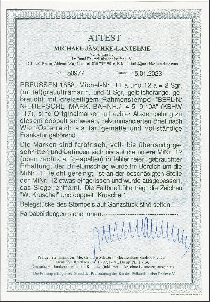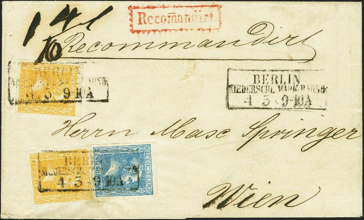| Zusatzinformationen und Suchstichworte: | 380. Auktion Heinrich Köhler Auktionstermin 25.03.2023 Los 183 3 Silbergroschen gelblichorange, 2 Einzelwerte, zusammen mit 2 Silbergroschen grauultramarin, alle farbfrisch und voll- bis sehr breitrandig, mit seltenem Rahmenstempel "BERLIN NIEDERSCHL.MÄRK.BAHNH. 4 5" auf Charge-Brief der 2.Gewichtsstufe nach Wien. Eine 3 Silbergroschen mit kleiner Papieraufspaltung rechts oben, die Briefhülle mit kleiner Verbesserung, sonst einwandfrei. Ein ungewöhnlicher Brief im Wechselverkehr mit Österreich. Signiert Kruschel und Fotoattest Jäschke-L. BPP (2023) Ausruf 300,00 EUR Zuschlag 360,00 EUR (aus der Sammlung Erivan Haub) |