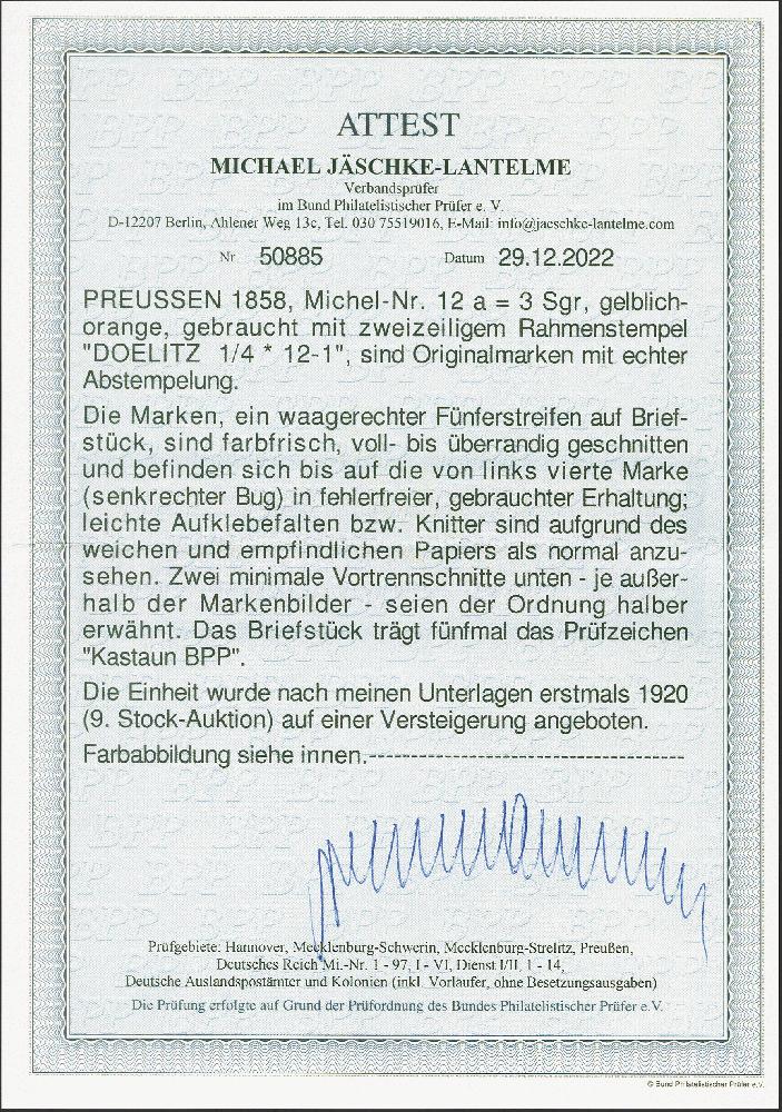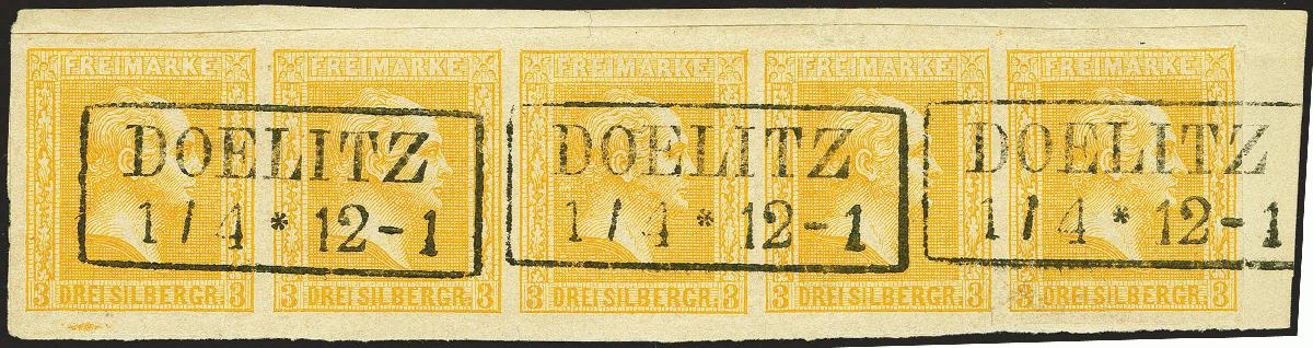 | Zusatzinformationen und Suchstichworte: | 380. Auktion Heinrich Köhler Auktionstermin 25.03.2023 Los 184 3 Silbergroschen gelblichorange im waagerechten 5er-Streifen, farbfrisch und voll- bis sehr breitrandig, mit dreimal sauber aufgesetztem Rahmenstempel "DOELITZ 1/4" auf Briefstück. Einige unauffällige Knitterspuren/Aufklebeknitter, insbesondere in der 2.Marke von rechts (laut Attest 'Bug') sonst einwandfrei. Eine attraktive und seltene Streifeneinheit. Signiert Kastanien BPP und Fotoattest Jäschke-L. BPP (2022) Ausruf 300,00 EUR Zuschlag 520,00 EUR (aus der Sammlung Erivan Haub) |
