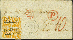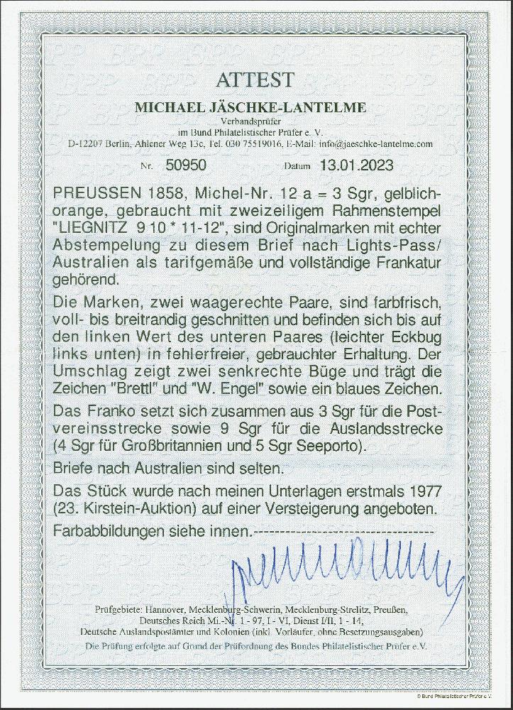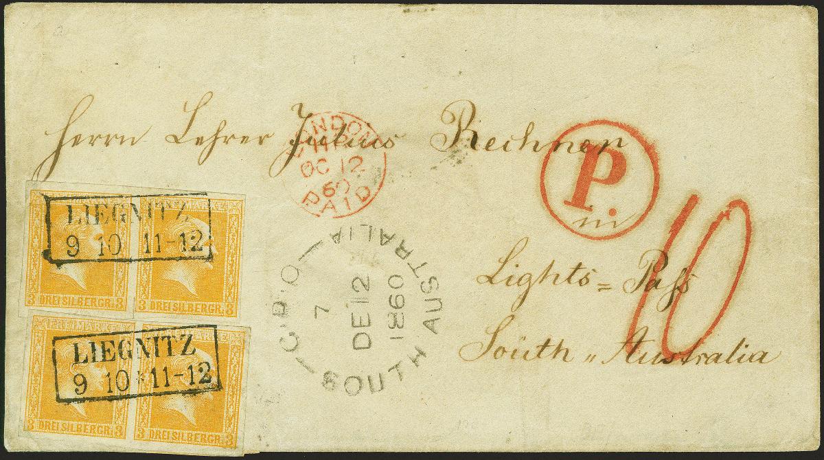 | Zusatzinformationen und Suchstichworte: | 380. Auktion Heinrich Köhler Auktionstermin 25.03.2023 Los 185 3 Silbergroschen gelblichorange, 2 waagerechte Paare, farbfrisch und voll- bis breitrandig, mit jeweils sauber aufgesetztem Rahmenstempel "LIEGNITZ 9 10" (1860) auf Briefkuvert über London nach Light Pass in Süd Australien mit vorderseitigem Anlandestempel "G.P.O. SOUTH-AUSTRALIA" und rückseitigem Ankunftsstempel von Angaston. Das Kuvert hat zwei Büge außerhalb der Frankatur, ein Wert der Frankatur transportbedingter kleine Eckbug, sonst einwandfreie und für diese Destination sehr frische Erhaltung. Ein attraktiver und sehr seltener Brief auf den 5.Kontinent. Signiert Brettl und Fotoattest Jäschke-L. BPP (2023) Ausruf 3.000,00 EUR Zuschlag 8.000,00 EUR (aus der Sammlung Erivan Haub) |