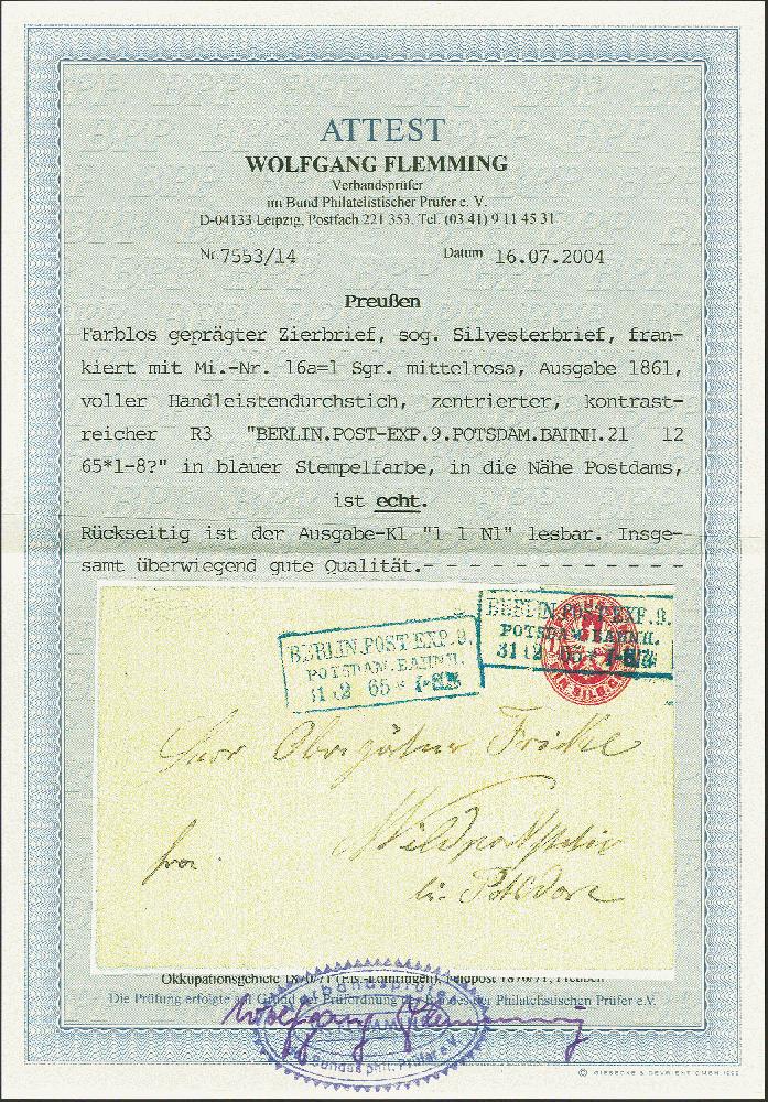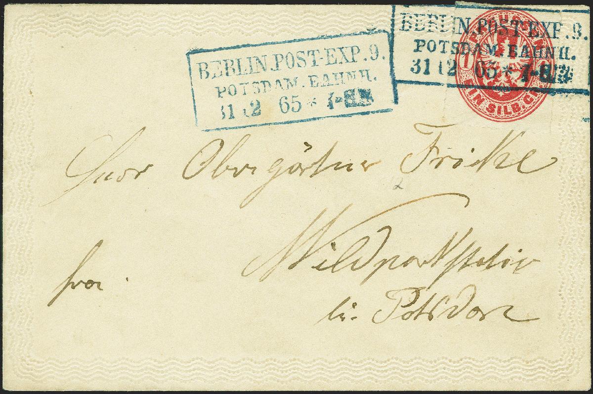 | Zusatzinformationen und Suchstichworte: | 380. Auktion Heinrich Köhler Auktionstermin 25.03.2023 Los 190 1 Silbergroschen rosa, farbfrisch und gut durchstochen, mit sauber auf- und nebengesetztem blauem Rahmenstempel "BERLIN POST-EXP. 9. POTSDAM BAHNH. 31 12 65" auf kleinem Briefkuvert mit farblos geprägter Zierborde nach Wildpark bei Potsdam. Die Marke gering über den Rand geklebt, schöne einwandfreie Erhaltung. Fotoattest Flemming BPP (2004) Ausruf 200,00 EUR Zuschlag 200,00 EUR (aus der Sammlung Erivan Haub) |