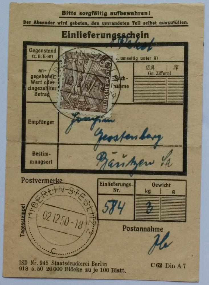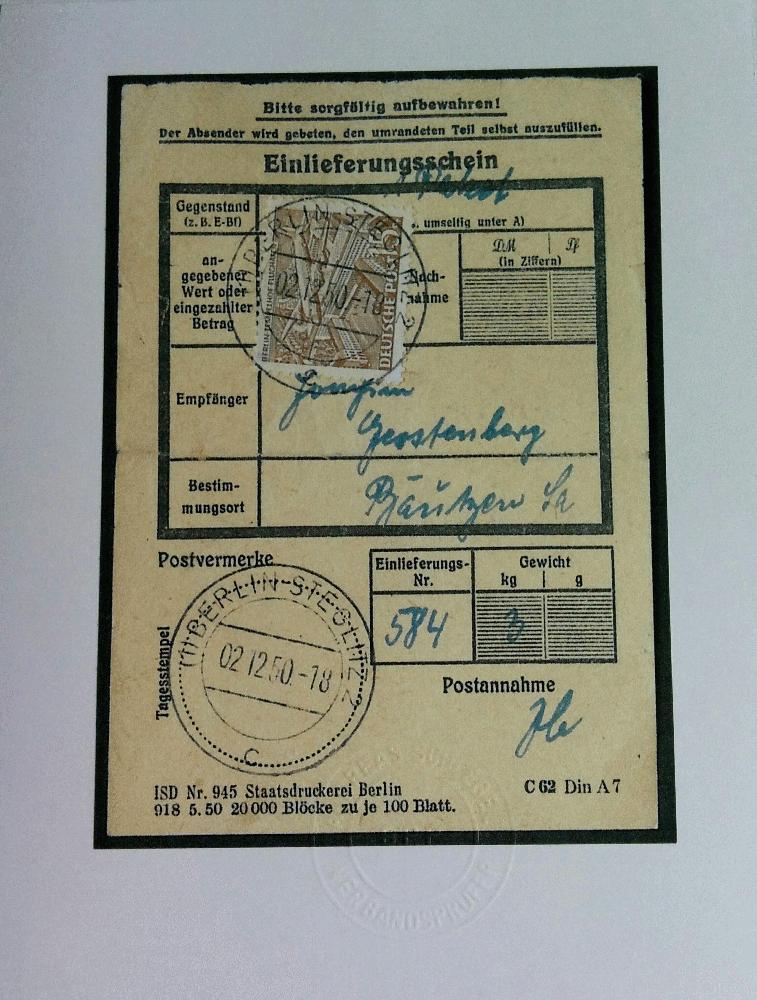 | Zusatzinformationen und Suchstichworte: | Gestempelt, Einlieferungsschein für ein Paket |