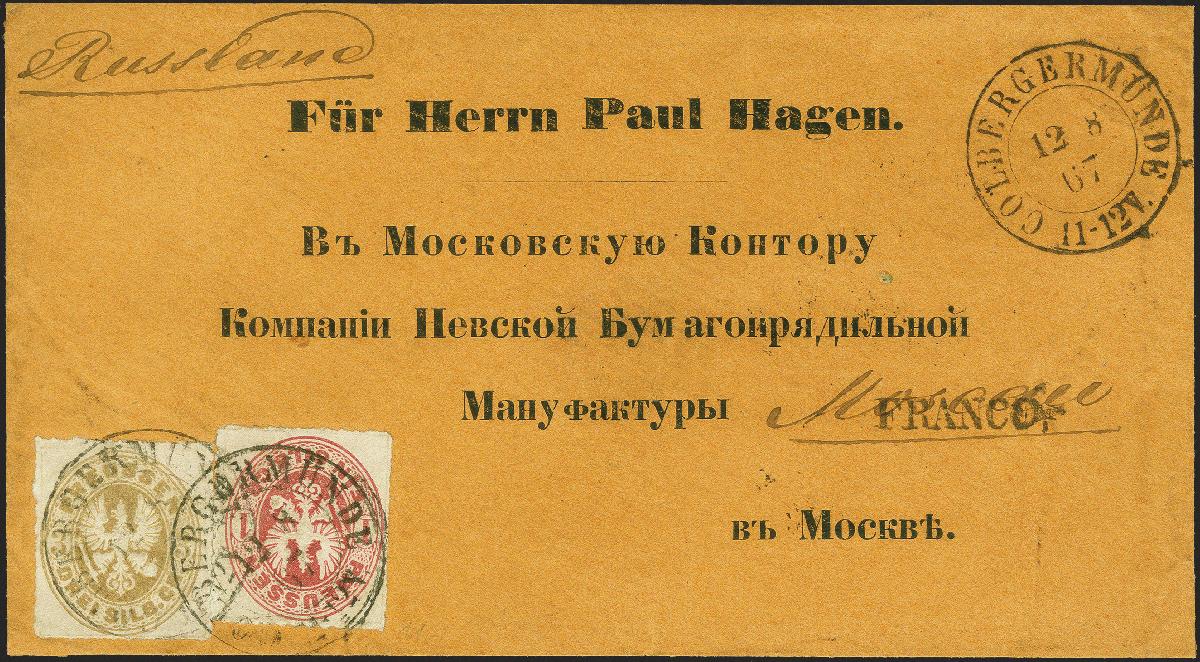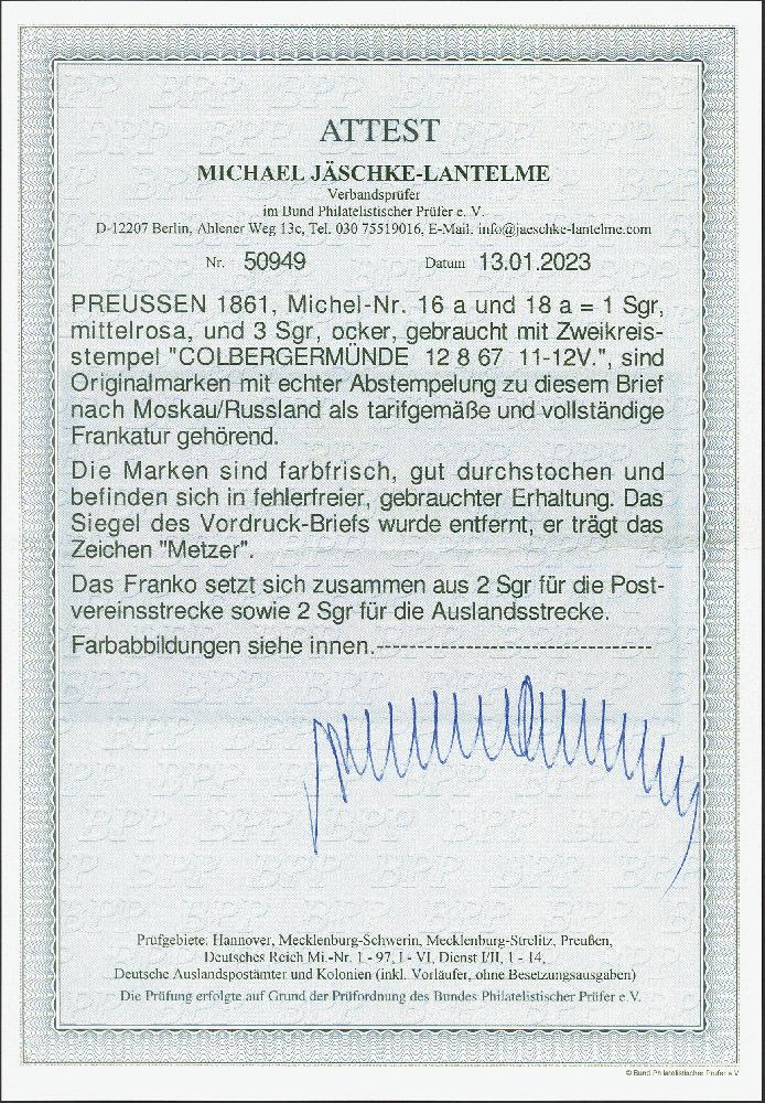 | Zusatzinformationen und Suchstichworte: | 380. Auktion Heinrich Köhler Auktionstermin 25.03.2023 Los 194 Wappenausgabe 1 Silbergroschen rosa und 3 Silbergroschen ocker, farbfrisch und gut durchstochen, mit sauber auf- und nebengesetztem Doppelkreisstempel "COLBERGERMÜNDE 12 8 67" auf Briefkuvert mit vorgedruckter Adresse nach Moskau mit Transit- und Ankunftsstempeln. Schöne einwandfreie Erhaltung. Ein sehr attraktiver Auslandsbrief. Signiert Metzer, Fotoattest Jäschke-L. BPP (2023) Ausruf 150,00 EUR Zuschlag 650,00 EUR (aus der Sammlung Erivan Haub) |