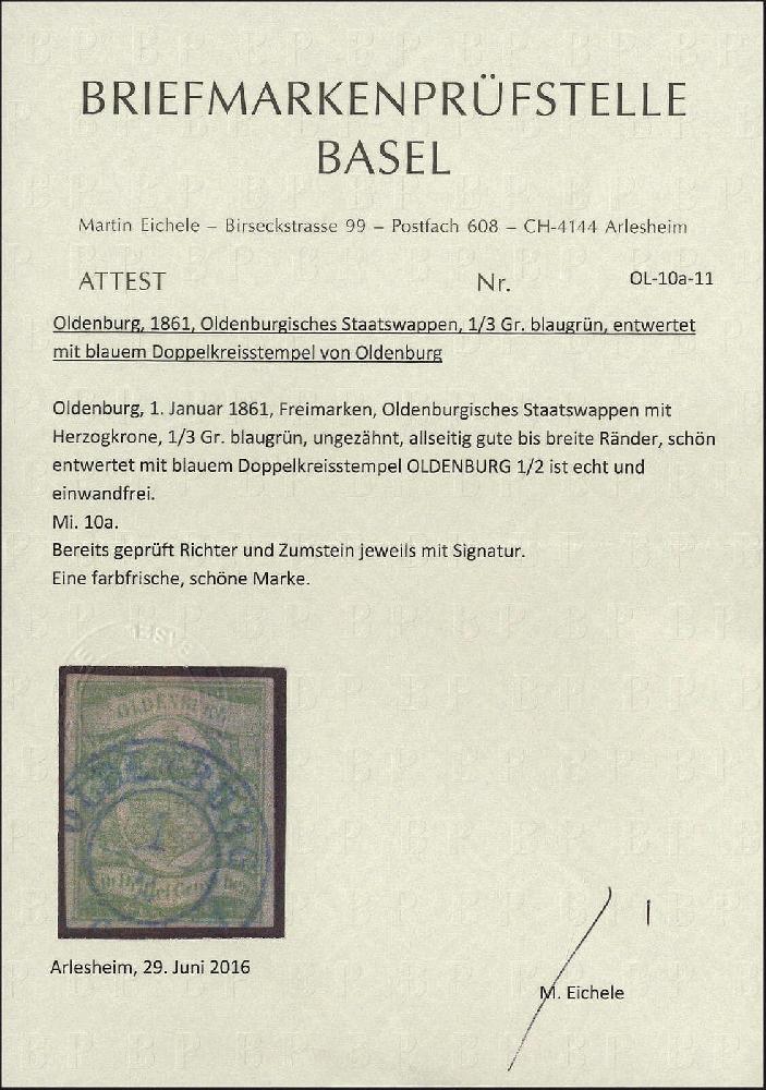 | Zusatzinformationen und Suchstichworte: | Götz 401. Auktion 6. - 10. März 2023 Los 3133 Altdeutschland Oldenburg 1/3 Gr. blaugrün, allseits breitrandig geschnitten, tadellos nahezu zentrisch entwertet mit blauem K2 "Oldenburg 1/2", signiert Richter u. Zumstein sowie Fotoattest Eichele. Mi. 1.000,- € Ausruf 250,00 EUR |