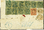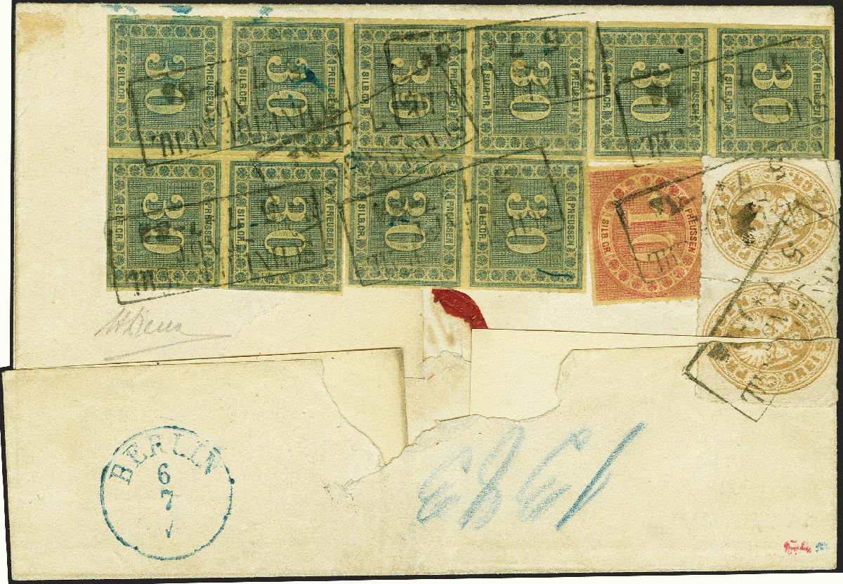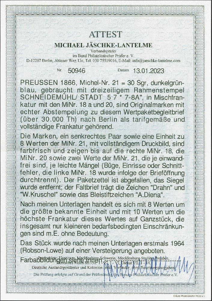 | Zusatzinformationen und Suchstichworte: | 380. Auktion Heinrich Köhler Auktionstermin 25.03.2023 Los 199 30 Silbergroschen dunkelgrünblau, unregelmäßiger 8er-Block und senkrechtes Paar, mit 10 Silbergroschen rosa und Wappen 3 Silbergroschen ocker im waagerechten Paar, mit Rahmenstempel "SCHNEIDEMÜHL STADT 5 7" rückseitig auf Wertpaketbegleitbrief nach Berlin. Die Innendienstmarken meist üblicher Scherenschnitt und wie immer kleine Beanstandungen, die linke 3 Silbergroschen-Marke bei Brieföffnung zerrissen; der Paketzettel abgefallen; insgesamt frische und attraktive Erhaltung. Eine insbesondere in der Preußen-Zeit außerordentlich seltene Frankatur. Größte bekannte gebrauchte Einheit der 30 Silbergroschen und höchste bekannte Frankatur dieses Wertes. Signiert Drahn und Kruschel, Fotoattest Jäschke-L. BPP (2023) Ausruf 3.000,00 EUR Zuschlag 7.000,00 EUR (aus der Sammlung Erivan Haub) |