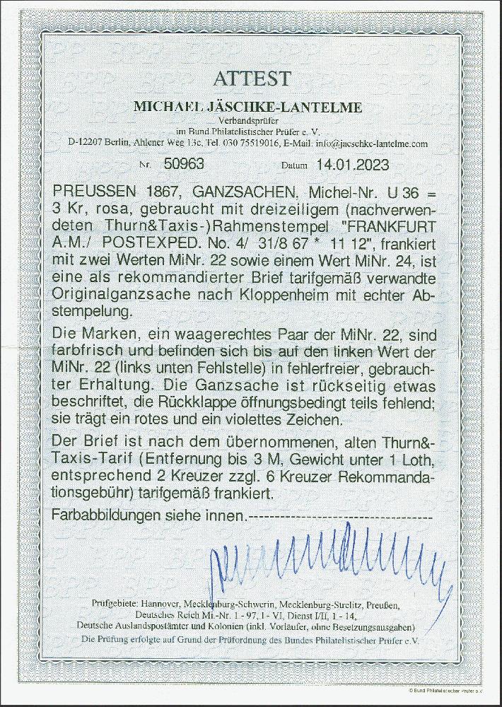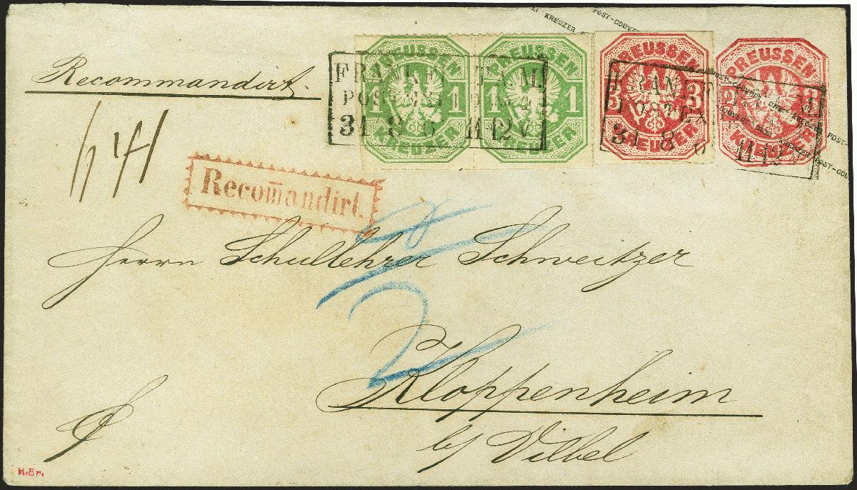 | Zusatzinformationen und Suchstichworte: | 380. Auktion Heinrich Köhler Auktionstermin 25.03.2023 Los 200 1 Kreuzer grün im waagerechten Paar und 3 Kreuzer rosa, alle farbfrisch und, bis auf einen Trennungsfehler bei der linken 1 Kreuzer, einwandfrei durchstochen, als Zufrankatur auf Ganzsachenumschlag 3 Kreuzer rosa, mit sauberem Rahmenstempel "FRANKFURT A.M.POSTEXPED. No.4 31/8 67" als Chargé-Brief nach Oppenheim bei Vilbel mit vorderseitig notiertem Bestellgeld. Eine dekorative und seltene Kombination in sonst einwandfreier Erhaltung. Fotoattest Jäschke-L. BPP (2023) Ausruf 500,00 EUR Zuschlag 1.150,00 EUR (aus der Sammlung Erivan Haub) |