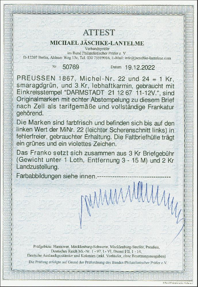 | Zusatzinformationen und Suchstichworte: | 380. Auktion Heinrich Köhler Auktionstermin 25.03.2023 Los 201 1 Kreuzer grün, 2 Einzelwerte, und 3 Kreuzer rosa, alle farbfrisch und, bis auf eine leichte Scherentrennung bei der linken 1 Kreuzer, einwandfrei durchstochen, mit sauber auf- und nebengesetztem Einkreisstempel "DARMSTADT 21 12 67" auf Briefhülle mit vorausfrankiertem Landbestellgeld nach Zell bei Bad Koenig mit Ankunftsstempeln vom 21., 22. und 23. Dezember. Eine seltene Frankatur in sonst einwandfreier Erhaltung. Fotoattest Jäschke-L. BPP (2023) Ausruf 400,00 EUR Zuschlag 400,00 EUR (aus der Sammlung Erivan Haub) |