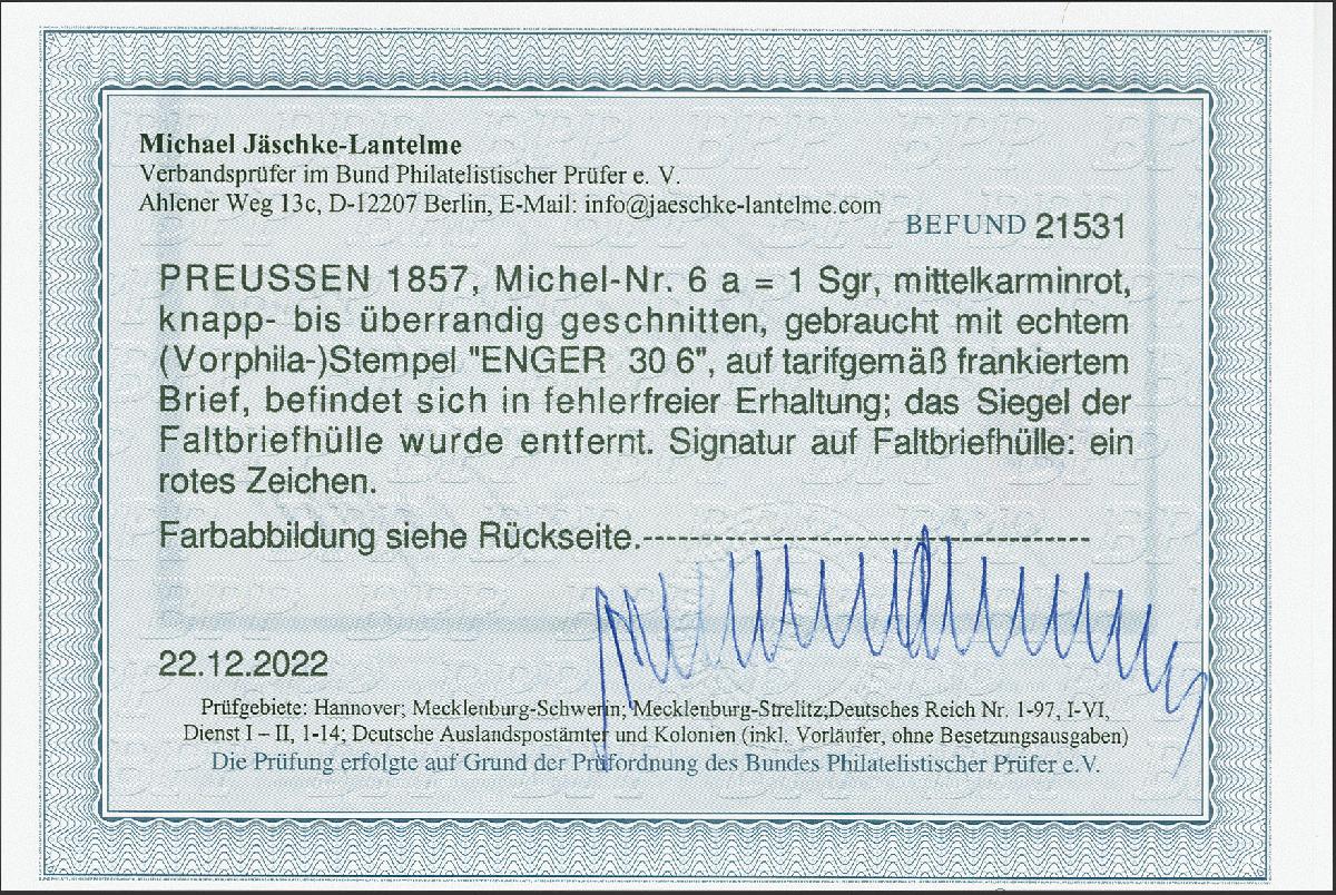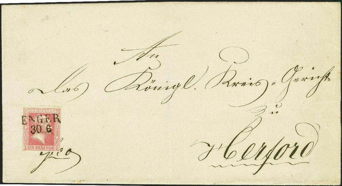 | Zusatzinformationen und Suchstichworte: | 380. Auktion Heinrich Köhler Auktionstermin 25.03.2023 Los 205 "ENGER 30 6", vorphilatelistischer Langstempel, glasklar auf Glatter Grund 1 Silbergroschen rosa, noch voll- bis breitrandig und farbfrisch, auf Briefhülle nach Herford. Schöne und einwandfreie Erhaltung. Fotobefund Jäschke-L. BPP (2022) Ausruf 300,00 EUR Zuschlag 1.600,00 EUR (aus der Sammlung Erivan Haub) |