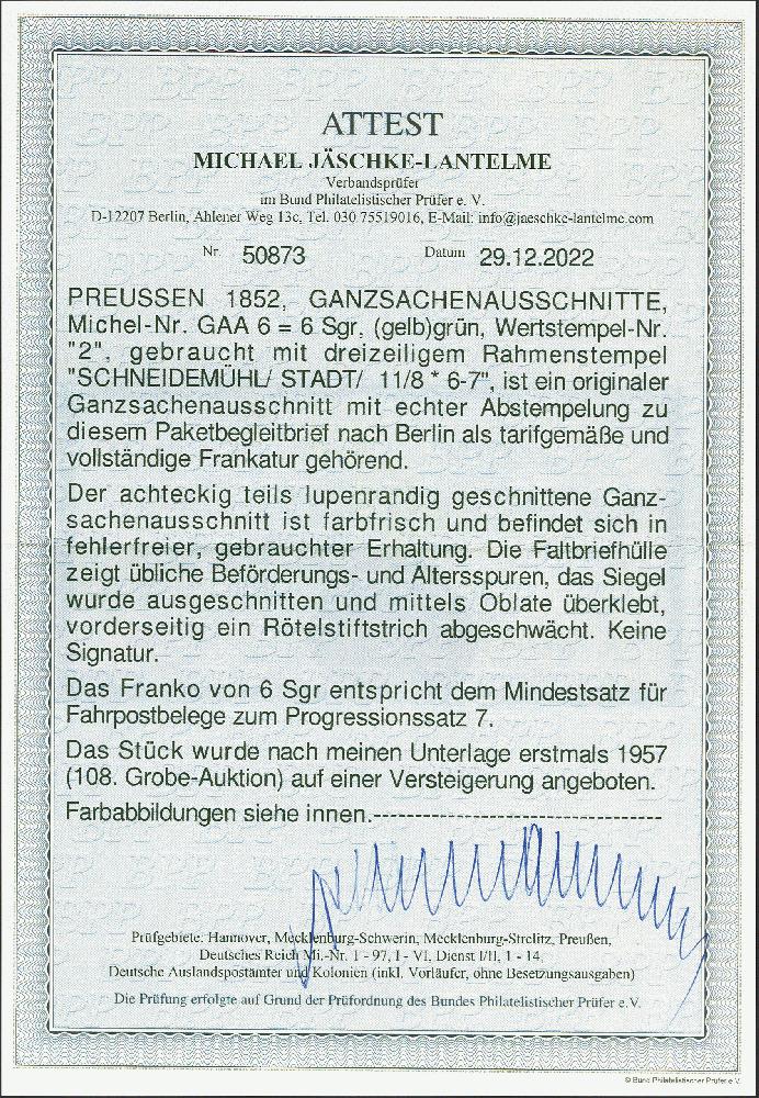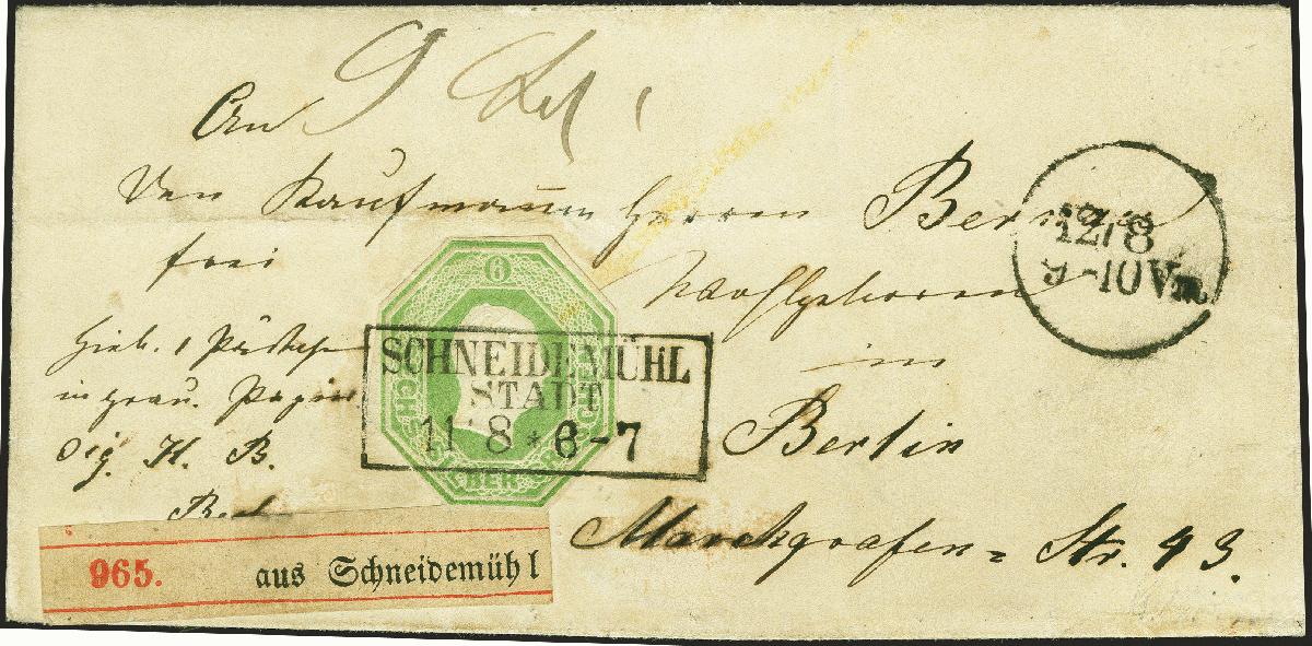 | Zusatzinformationen und Suchstichworte: | 380. Auktion Heinrich Köhler Auktionstermin 25.03.2023 Los 212 Oktogon-Ausschnitt 6 Silbergroschen gelbgrün, Schilling-Nr. 2, noch voll- bis breitrandig achteckig geschnitten, mit sauber aufgesetztem Rahmenstempel "SCHNEIDEMÜHL STADT 11/8" auf kleinem Paketbegleitbrief mit vorderseitigen Paketzettel nach Berlin. Das rückseitige Siegel ausgeschnitten und mit Oblate überklebt, ein vorderseitiger Rötelstrich abgeschwächt, sonst einwandfrei. Fotoattest Jäschke-L. BPP (2022) Ausruf 300,00 EUR Zuschlag 650,00 EUR (aus der Sammlung Erivan Haub) |