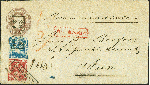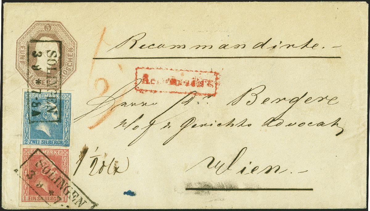 | Zusatzinformationen und Suchstichworte: | 380. Auktion Heinrich Köhler Auktionstermin 25.03.2023 Los 213 Oktogon 5 Silbergroschen lila, Schilling-Nr. 2, mit Zufrankatur Gittergrund 1 Silbergroschen rosa und 2 Silbergroschen blau, beide farbfrisch und breit- bis überrandig, mit sauber aufgesetztem Rahmenstempel "SOLINGEN 3 9" als Chargé-Brief der 2. Gewichtsstufe nach Wien mit Ankunftsstempel. Ein sehr attraktives Stück in einwandfreier Erhaltung. Oktogone mit Zufrankatur der Gittergrund-Ausgabe sind sehr selten; in dieser Kombination haben wir kein weiteres Stück registriert. Fotoattest Jäschke-L. BPP (2022) Ausruf 1.000,00 EUR Zuschlag 2.100,00 EUR (aus der Sammlung Erivan Haub) |