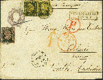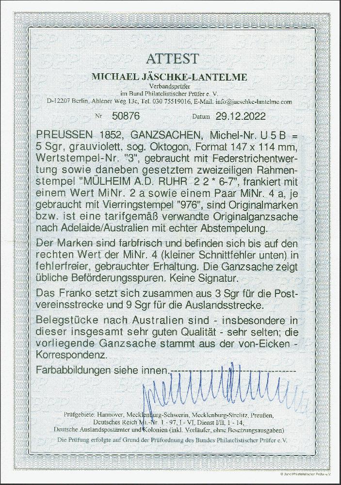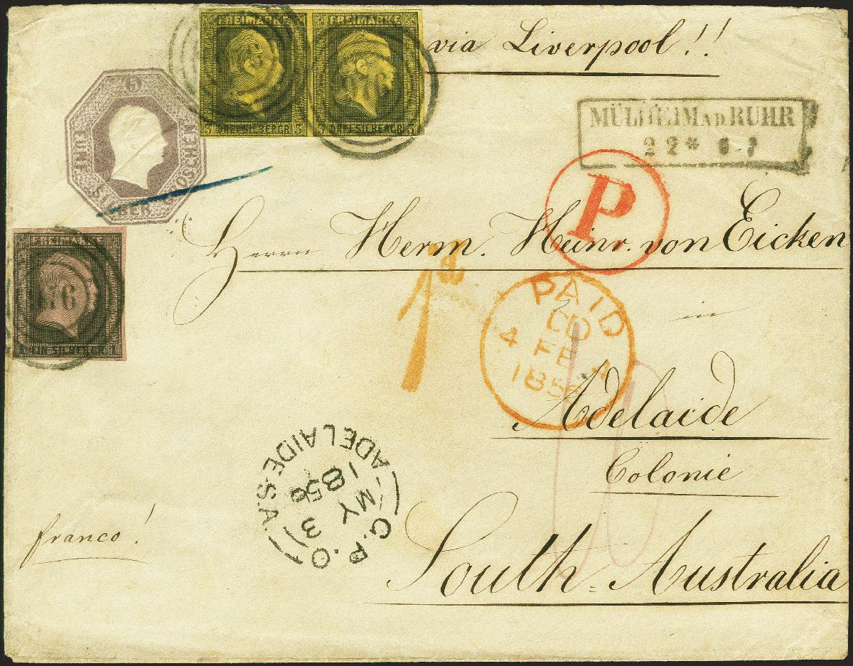 | Zusatzinformationen und Suchstichworte: | 380. Auktion Heinrich Köhler Auktionstermin 25.03.2023 Los 215 1852, Oktogon-Umschlag 5 Silbergroschen grauviolett im Großformat, mit Zufrankatur 1850, 1 Silbergroschen schwarz auf rosa und 3 Silbergroschen schwarz auf gelb im waagerechten Paar, alle meist voll- bis breitrandig, lediglich die rechte 3 Silbergroschen unten kurz berührt, mit Nummernstempel "976" und nebengesetztem Aufgabestempel "MÜLHEIM A.D. RUHR 2 2" (1856) über Belgien und England nach Adelaide in Südaustralien mit vorderseitigem Eingangsstempel vom 3. Mai. Sehr schöne und für diese Destination bemerkenswert frische Erhaltung. Ein seltener Brief der bekannten 'von Eicken'-Korrespondenz auf den 5. Kontinent. Fotoattest Jäschke-L. BPP (2022) Ausruf 4.000,00 EUR Zuschlag 5.000,00 EUR (aus der Sammlung Erivan Haub) |
