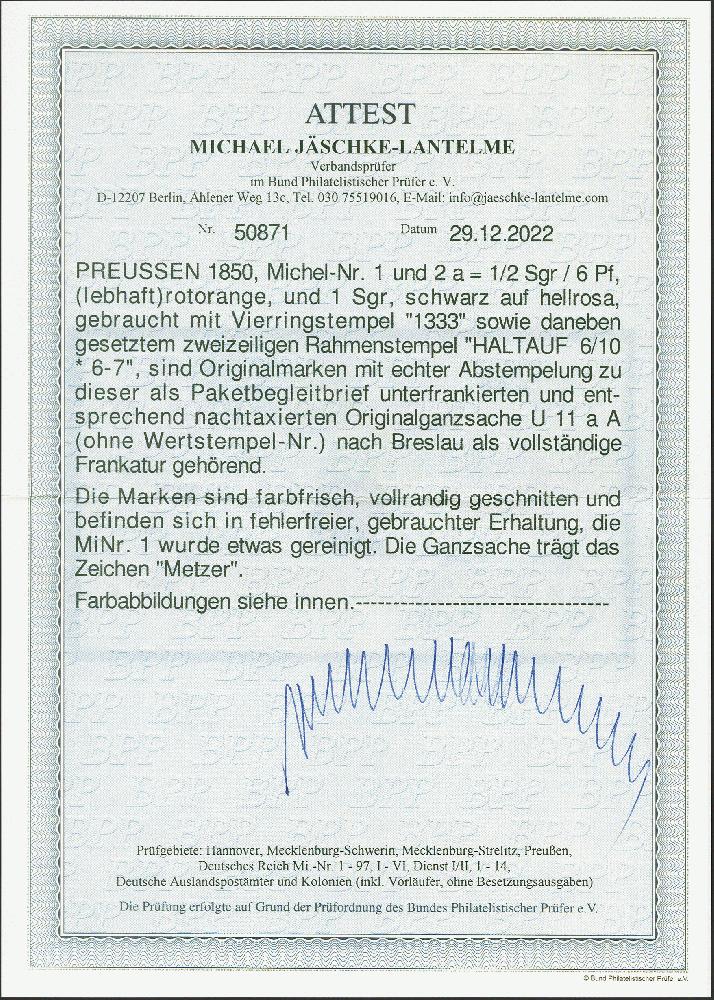 | Zusatzinformationen und Suchstichworte: | 380. Auktion Heinrich Köhler Auktionstermin 25.03.2023 Los 218 1855, Umschlag 1 Silbergroschen rosa mit Zufrankatur ½ Silbergroschen rotorange und 1 Silbergroschen auf hellrosa, beide voll- bis breitrandig, mit klar aufgesetzter Nr. "1333", mit nebengesetztem Rahmenstempel "HALTAUF 6/10" als Paketbegleitbrief nach Breslau. Die ½ Silbergroschen etwas gereinigt, sonst einwandfrei. Eine attraktive Kombination. Signiert Metzer, Fotoattest Jäschke-L. BPP (2022) Ausruf 200,00 EUR Zuschlag 280,00 EUR (aus der Sammlung Erivan Haub) |