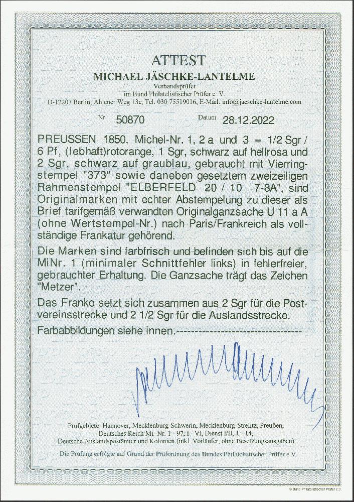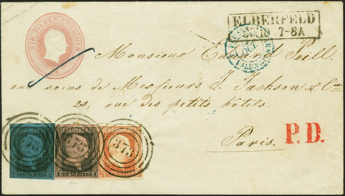 | Zusatzinformationen und Suchstichworte: | 380. Auktion Heinrich Köhler Auktionstermin 25.03.2023 Los 219 1855, Umschlag 1 Silbergroschen rosa mit Zufrankatur ½ Silbergroschen rotorange, 1 Silbergroschen auf hellrosa und 2 Silbergroschen auf blau, meist voll- bis breitrandig, nur die ½ Silbergroschen einmal kurz berührt, mit je sauber aufgesetzter Nr. "373" und nebengesetztem Rahmenstempel "ELBERFELD 20 10" nach Paris. Eine attraktive und seltene Frankatur Kombination. Signiert Metzer und Fotoattest Jäschke-L. BPP (2022) Ausruf 300,00 EUR Zuschlag 750,00 EUR (aus der Sammlung Erivan Haub) |